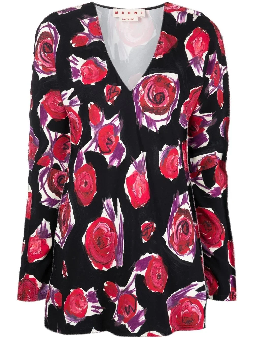 rose print top Marni is known for its bright, artistic patterns and this V-neck long sleeve top encapsulates the Italian house's aesthetic beautifully with its colourful, painted rose print. Made in Italy Composition Viscose 100% SIZE & FIT Model measurements Height 5 ft 10 in(1.79 m) Bust/Chest 31.49 in(80 cm) Hips 35.03 in(89 cm) Waist 23.62 in(60 cm) FittingInformation This piece fits true to size. We recommend you get your regular size Cut for a loose fit Made with a mid-weight non-stretch fabric Measurement SLEEVE LENGTH 18.89 in(48 cm) LENGTH 30.31 in(77 cm) WAIST 37 in(94 cm) BUST 35.43 in(90 cm) Washing instructions Dry Clean Only