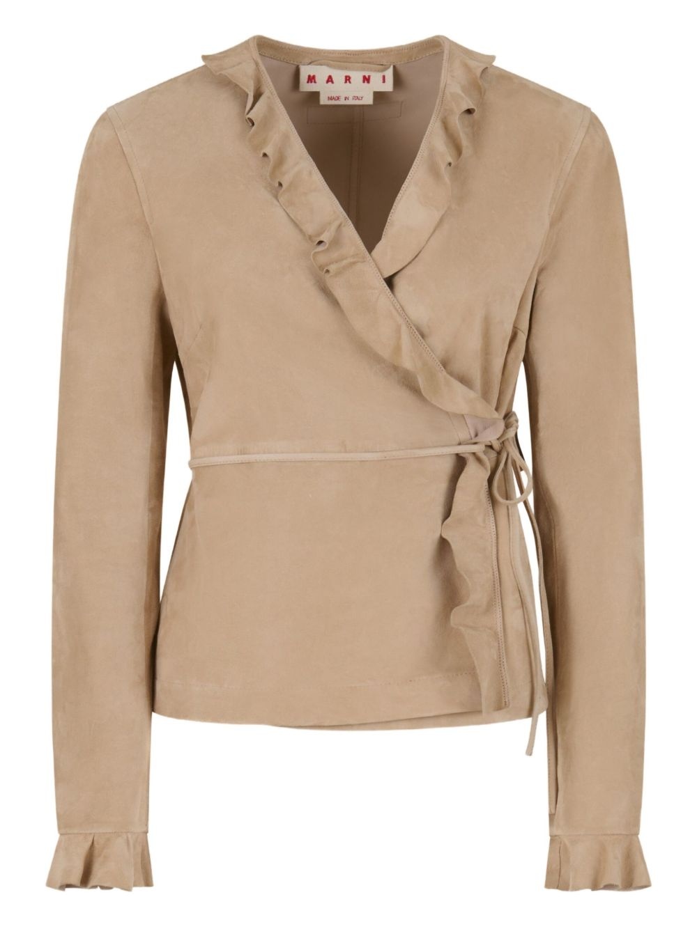 ruffled wrap jacket Highlights - Beige - Ruffled neckline - Wrap design - Tie closure - Flared cuffs Made in Italy Composition Lamb Skin 100%, Sheepskin 100%