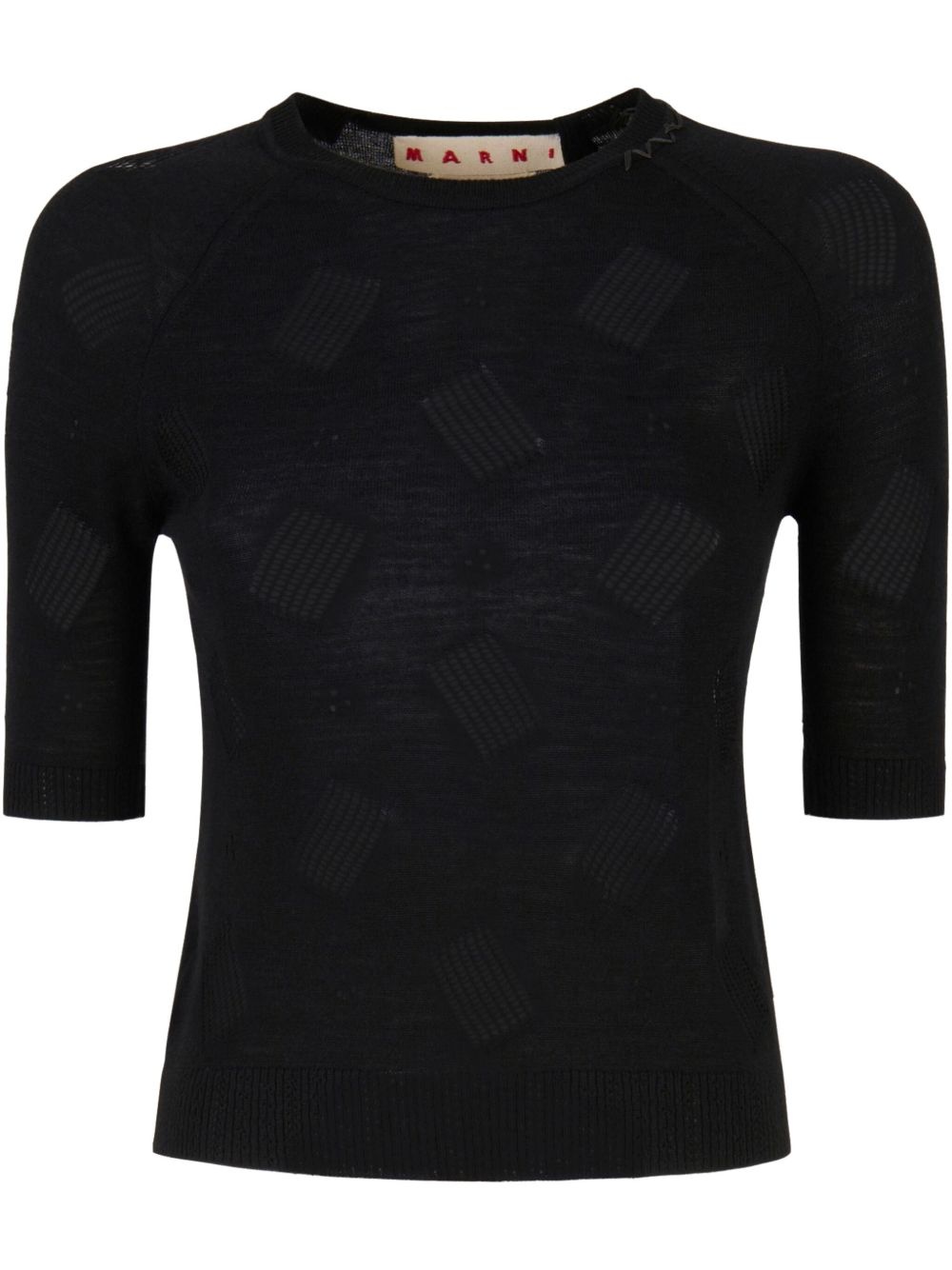 short-sleeve textured top Highlights - Black - Knitted texture - Square pattern - Crew neckline - Fitted silhouette - Short sleeves Imported Composition Virgin Wool 70%, Silk 30%