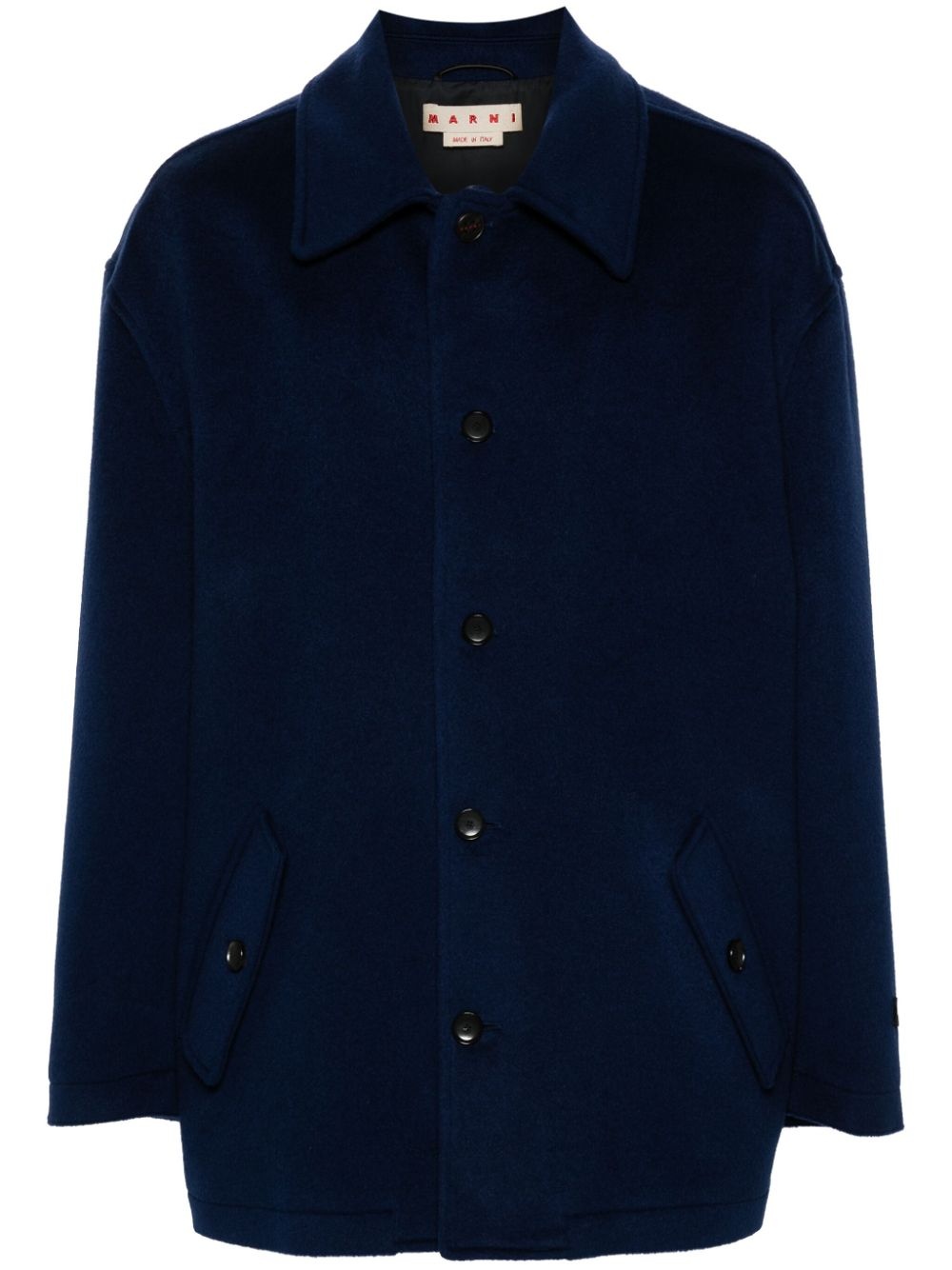 single-breasted coat Highlights - Navy blue - Virgin wool blend - Brushed effect - Logo tag - Oversized pointed collar - Long sleeves - Two side button-fastening flap pockets - Straight hem - Full lining - Front button fastening Made in Italy Composition Outer: Virgin Wool 80%, Mohair 20% Lining: Cotton 69%, Polyamide 31% SIZE & FIT Model measurements Height 6 ft 2 in(1.87 m) Bust/Chest 36.41 in(92.5 cm) Hips 37 in(94 cm) Waist 29.52 in(75 cm) FittingInformation Designed to be unstructured, offering a loose fit throughout Made from a midweight non-stretch fabric This piece fits true to size – take your usual size