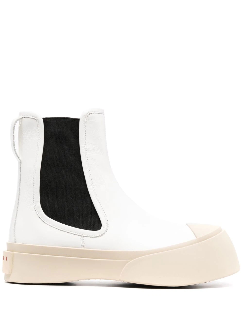 Pablo leather Chelsea boots Marni's ankle boots are a seamless blend of contemporary styling with classic edge. The all-white leather pair are placed atop a chunky rubber sole for a modern twist. Highlights - Black/white - Calf leather - Logo print to the rear - Slip-on style - Round toe - Flat sole - Ankle-length Made in Italy Composition Leather 100% SIZE & FIT Measurement HEEL 1.37 in(3.5 cm)