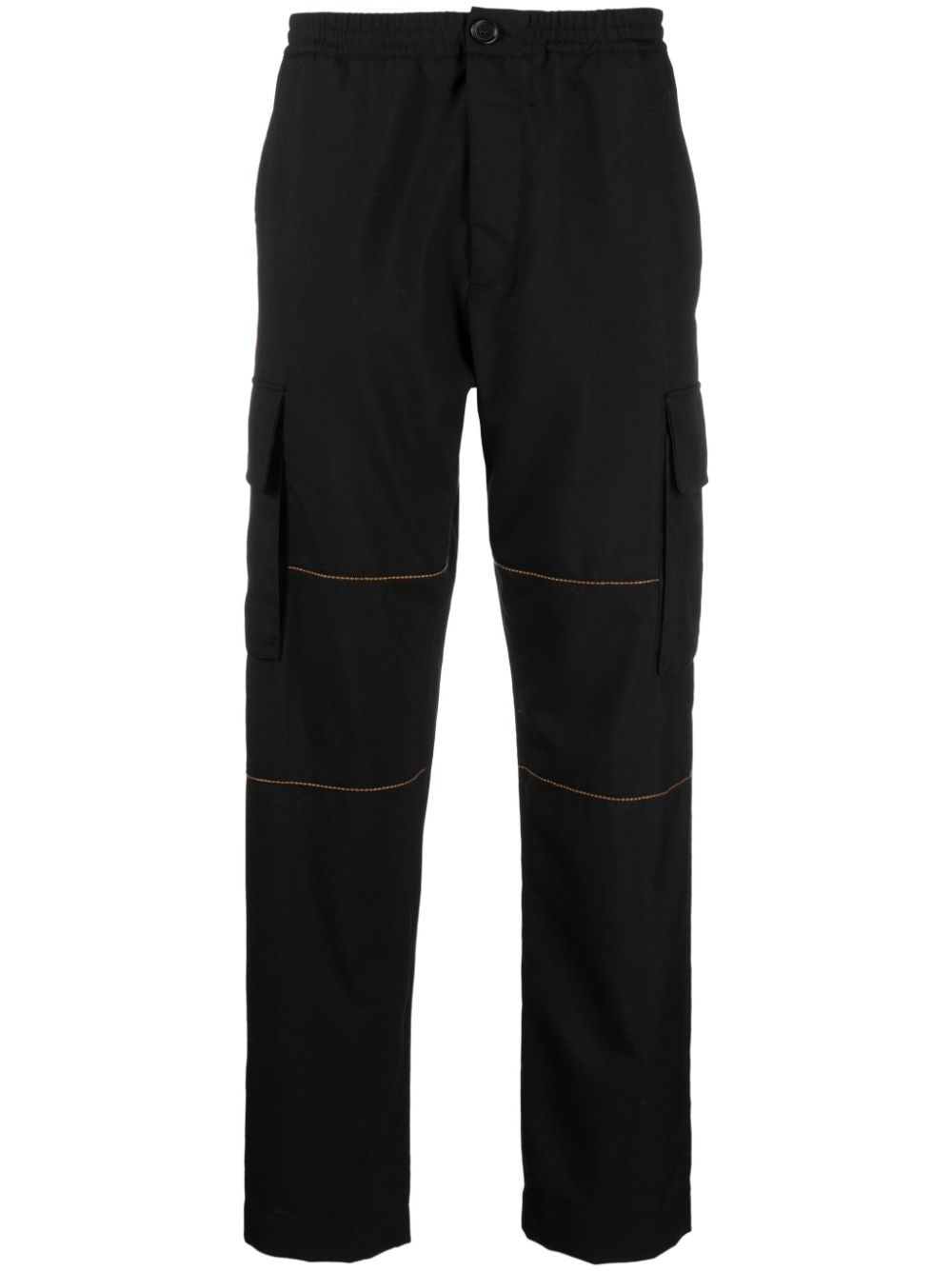 straight-leg virgin-wool trousers Marni showcases expert Italian craftsmanship in these cargo trousers. Cut from black virgin wool, they boast a straight leg and contrast orange stitching – a nod to the brand's artistic aesthetic. Highlights - Black - Virgin wool - Contrast stitching - Elasticated waistband - Front button and zip fastening - Two side inset pockets - Two side flap pockets - Two rear button-fastening pockets - Straight leg Imported Composition Outer: Virgin Wool 100% Lining: Cotton 69%, Polyamide 31% SIZE & FIT Model measurements Height 6 ft 2 in(1.89 m) Bust/Chest 39.76 in(101 cm) Hips 37.4 in(95 cm) Waist 29.92 in(76 cm) FittingInformation Designed for a straight-leg, allowing for an unrestricted and comfortable fit over the leg Adjust this piece’s waistband to your preference using the drawstring Made from a midweight non-stretch fabric This piece fits true to size – take your usual size
