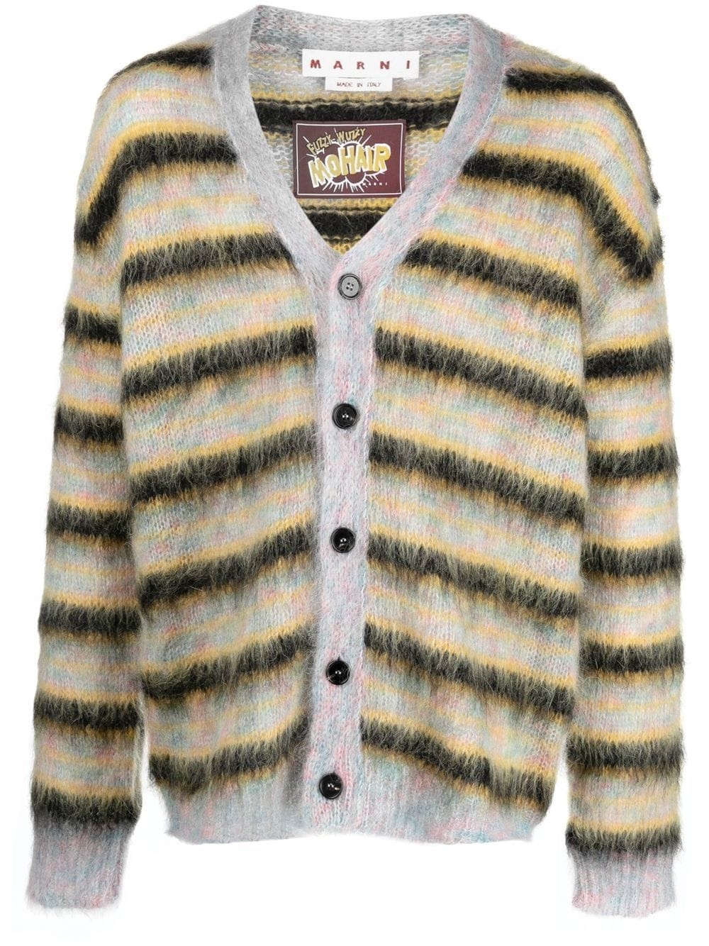 striped mohair-blend cardigan multicolour mohair blend brushed effect horizontal stripe pattern front button fastening V-neck extra-long sleeves Made in Italy Composition Mohair 67%, Polyamide 28%, Wool 5% SIZE & FIT Model measurements Height 6 ft 2 in(1.87 m) Bust/Chest 38.18 in(97 cm) Hips 36.61 in(93 cm) Waist 29.13 in(74 cm) Measurement CHEST 48.03 in(122 cm) SLEEVE LENGTH 38.58 in(98 cm) WAIST 46.45 in(118 cm) FittingInformation This piece fits true to size. We recommend you get your regular size Cut for a loose fit Made with a mid-weight fabric