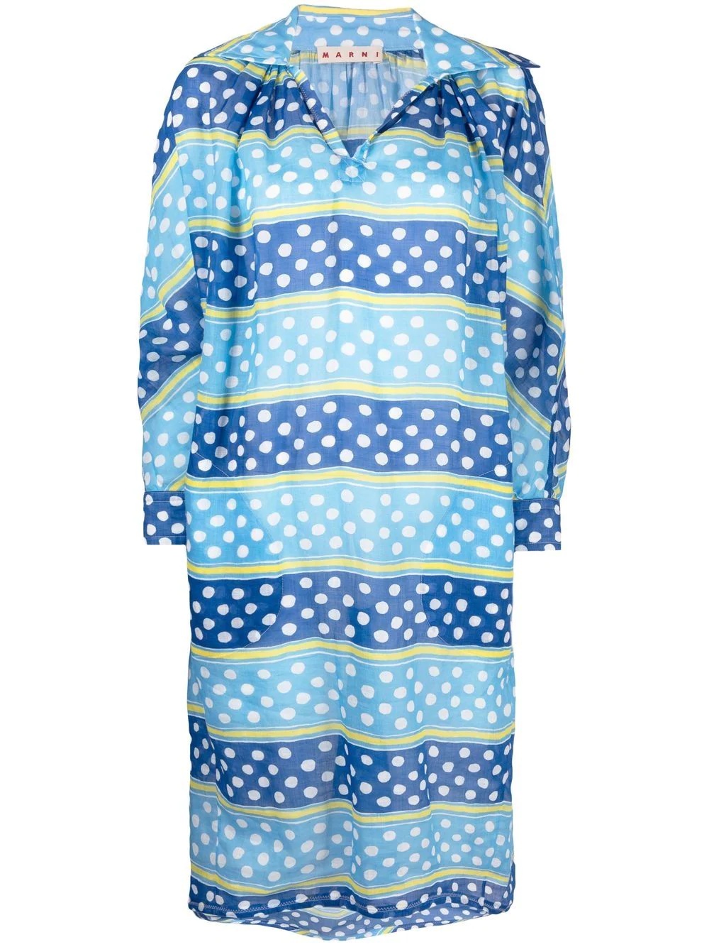 striped polka dot dress Marni’s collections are characterised by spirited colours and lively prints, both featured in this shirtdress from their AW21 collection. Its spread-collar design showcases bold polka dots mixed with horizontally striped panels for a joyful look. Highlights - White/yellow/blue - Ramie - Polka dot print - Horizontal stripe print - Spread collar - Long sleeves - Two side inset pockets Made In Italy Composition Ramie 100% SIZE & FIT Model measurements Height 5 ft 10 in(1.79 m) Bust/Chest 31.49 in(80 cm) Hips 34.25 in(87 cm) Waist 22.83 in(58 cm) Measurement BUST 56.69 in(144 cm) LENGTH 45.66 in(116 cm) Shoulder Width 23.62 in(60 cm) SLEEVE LENGTH 23.62 in(60 cm) WAIST 56.69 in(144 cm) FittingInformation This piece fits true to size. We recommend you get your regular size Cut for a loose fit Made with a mid-weight fabric Washing instructions Dry Clean Only