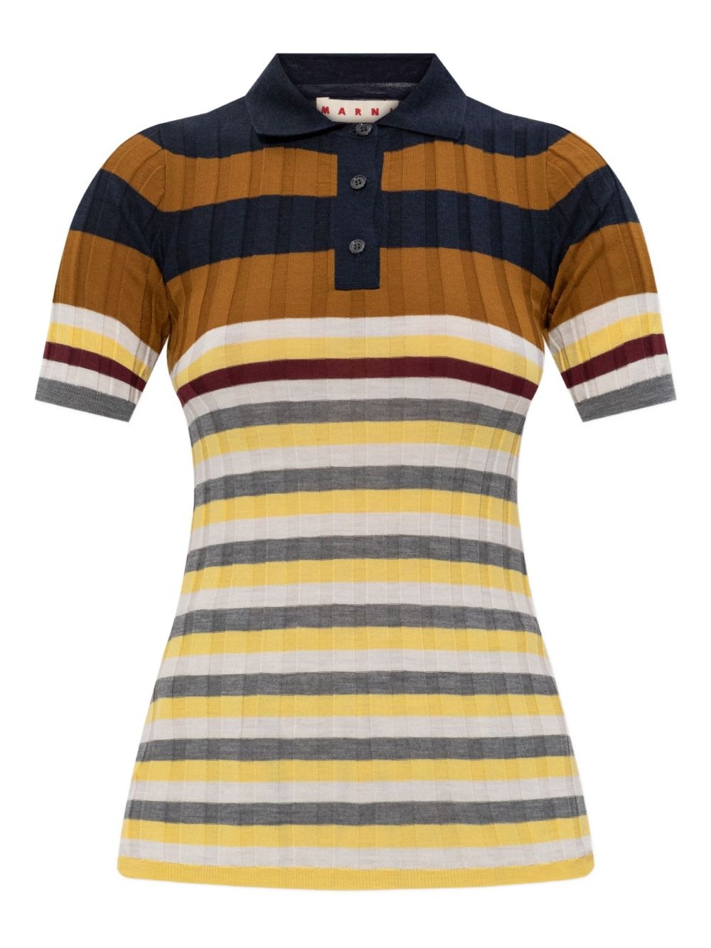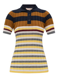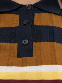 striped polo top Highlights - Brown - Ribbed design - Three-button placket - Short sleeves - Contrasting stripes Imported Composition Virgin Wool 100% Washing instructions Read Manufacturer Guidelines
