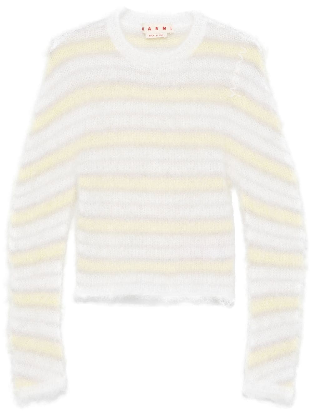 striped sweater Highlights - White/light yellow/light grey - Mohair blend - Brushed effect - Horizontal stripe pattern - Ribbed crew neck - Embroidered logo to the shoulder - Long sleeves - Straight hem Made in Italy Composition Mohair 80%, Polyamide 20% SIZE & FIT Model measurements Height 5 ft 11 in(1.8 m) Bust/Chest 32.67 in(83 cm) Hips 36.22 in(92 cm) Waist 24.4 in(62 cm) FittingInformation Designed for a slim fit that sits just away from the body offering a close yet comfortable fit Made with a midweight knit, this piece offers some stretch