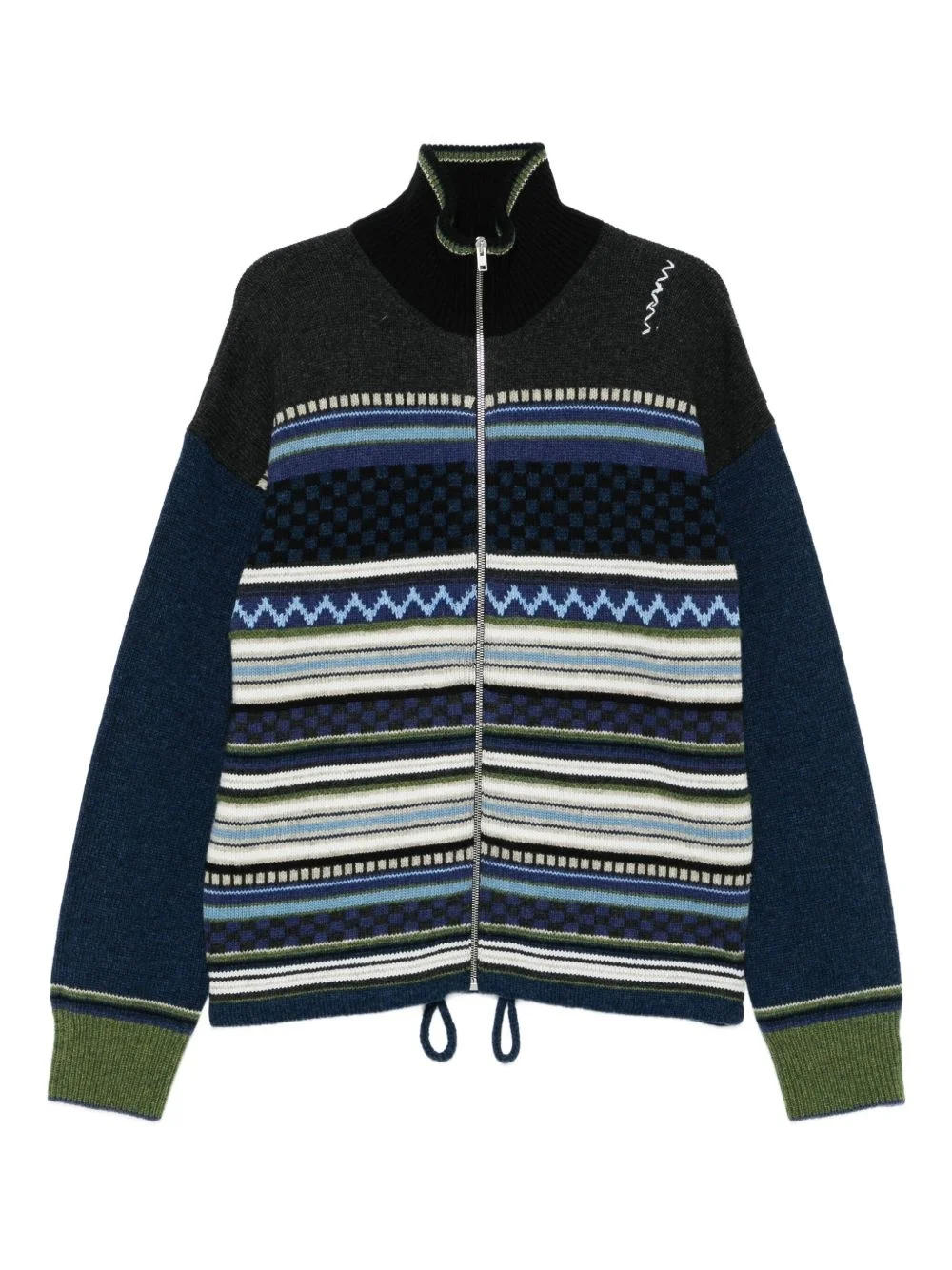 striped zip-up cardigan Highlights - Glass blue - Wool - High neck - Zip fastening - Drawstring hem - Multicoloured striped pattern - Geometric pattern Made in Italy Composition Virgin Wool 100% Washing instructions Dry Clean Only