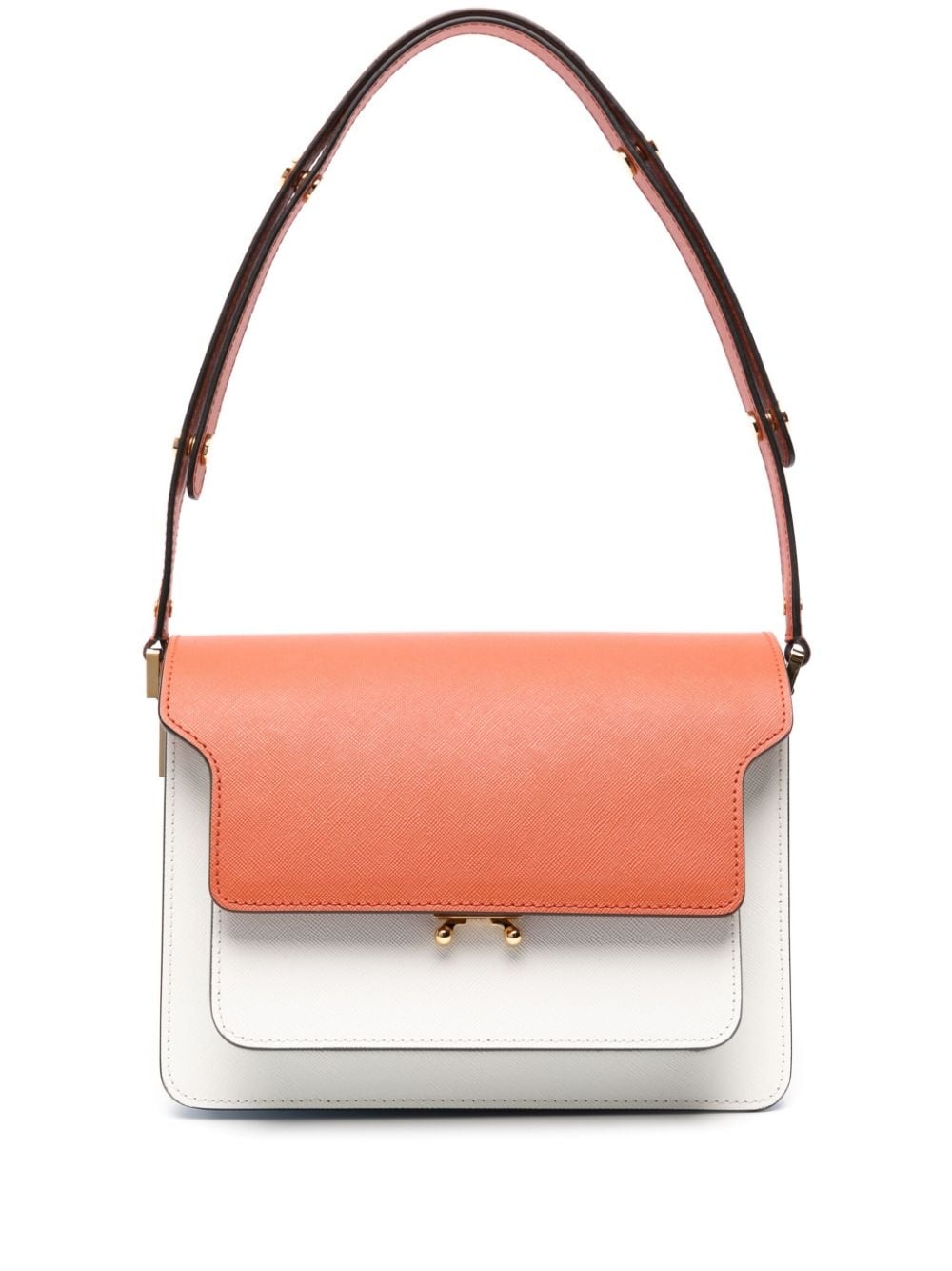 Trunk shoulder bag Highlights - Burnt orange/light blue/off-white - Calf leather - Colour-block design - Internal logo patch - Gold-tone hardware - Gusset detail - Foldover top - Clasp fastening - Adjustable shoulder strap - Partitioned compartment - Internal zip-fastening pocket Made in Italy Composition Brass 100%, Steel 100% Lining: Cotton 100% Outer: Calf Leather 100% SIZE & FIT Model measurements Height 5 ft 10 in(1.77 m) Bust/Chest 32.28 in(82 cm) Hips 35.03 in(89 cm) Waist 25.19 in(64 cm) Measurement DEPTH 5.11 in(13 cm) HEIGHT 6.29 in(16 cm) STRAP 23.62 in(60 cm) WIDTH 9.05 in(23 cm)