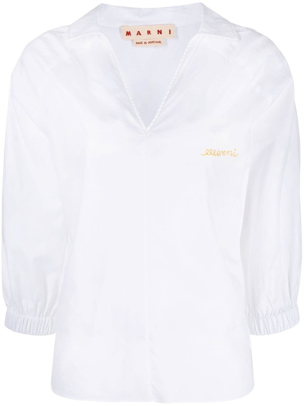 V-neck cotton blouse white cotton logo print at the chest V-neck spread collar three-quarter length sleeves straight hem Imported Composition Cotton 100% SIZE & FIT Model measurements Height 5 ft 10 in(1.79 m) Bust/Chest 31.1 in(79 cm) Hips 35.03 in(89 cm) Waist 24.01 in(61 cm) Measurement HIPS 40.94 in(104 cm) FittingInformation This piece fits true to size. We recommend you get your regular size Cut for a loose fit Made with a mid-weight non-stretch fabric Washing instructions Hand Wash