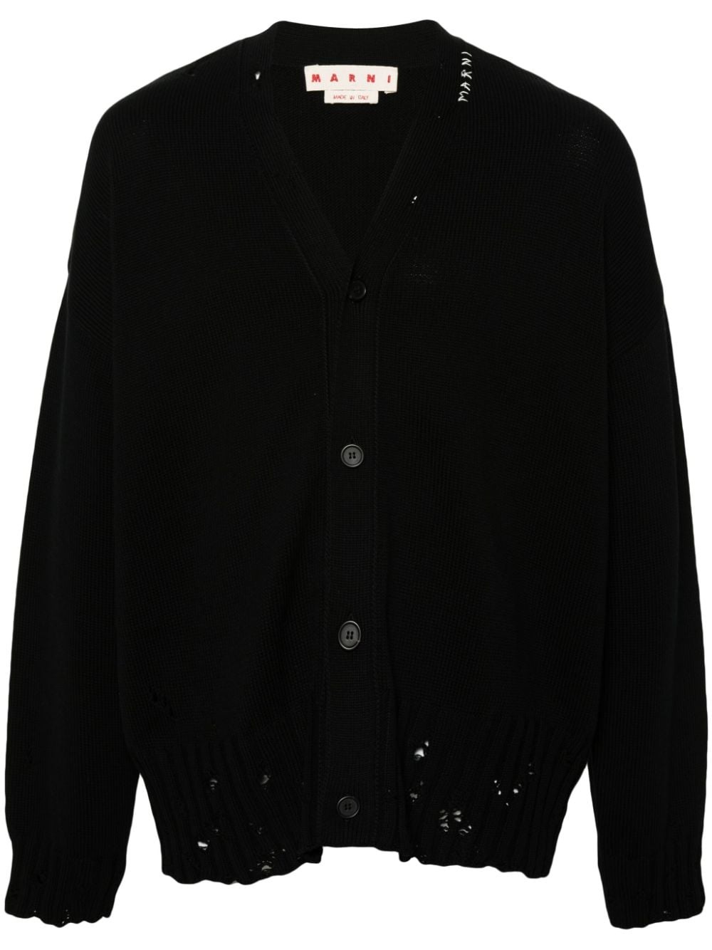 V-neck cotton cardigan Highlights - Black - Cotton - Knitted construction - Distressed effect - Embroidered logo to the side - Ribbed trim - V-neck - Front button fastening - Drop shoulder - Long sleeves - Straight hem Made in Italy Composition Cotton 100% SIZE & FIT Model measurements Height 6 ft 2 in(1.87 m) Bust/Chest 36.41 in(92.5 cm) Hips 37 in(94 cm) Waist 29.52 in(75 cm) FittingInformation Designed for a regular fit, offering a comfortable loose fit throughout the body Made with a midweight knit, this piece offers some stretch This piece fits true to size – take your usual size