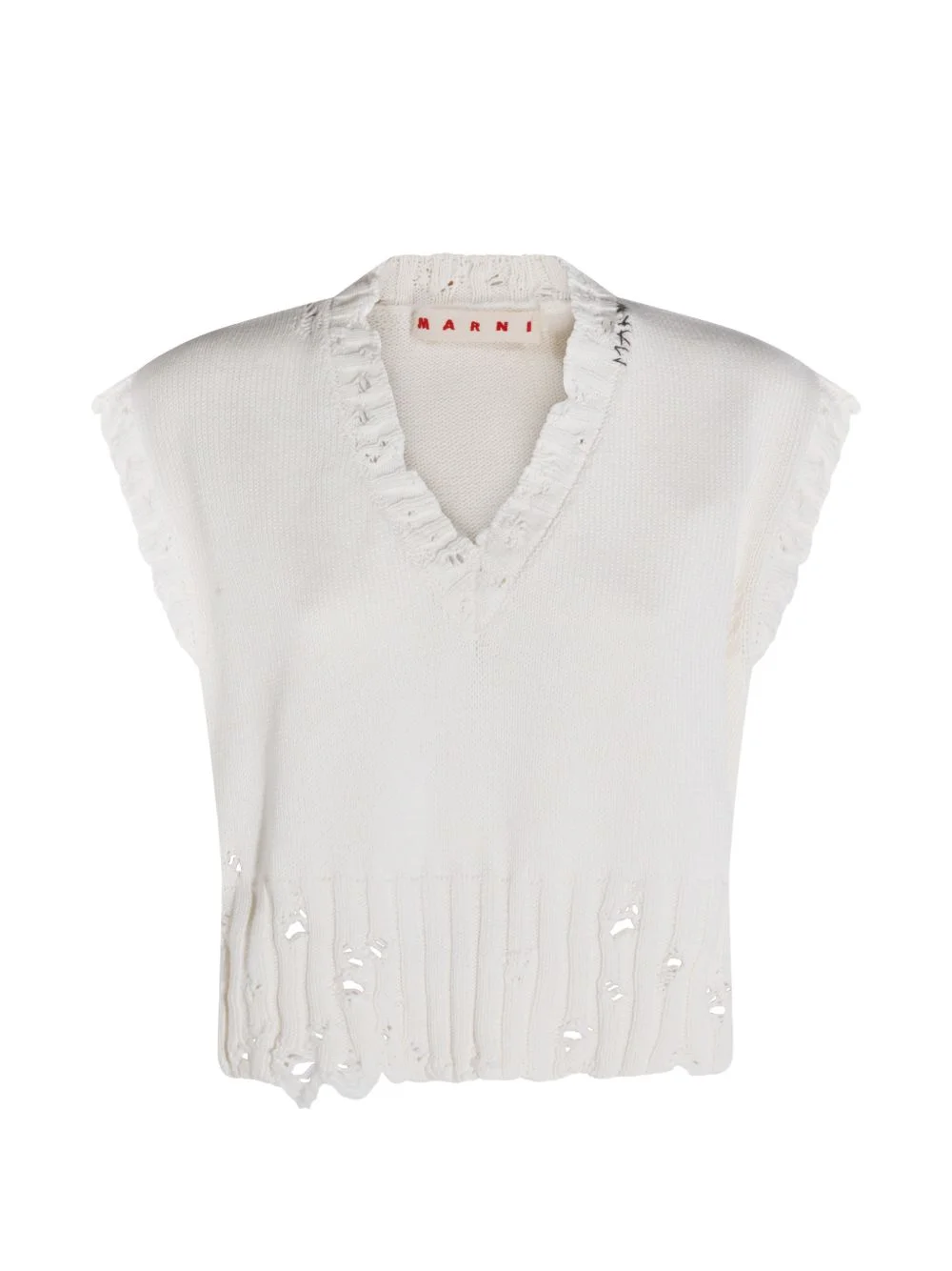 V-neck distressed top Highlights - White - Cotton - V-neck - Fringed trim - Sleeveless - Distressed detailing Imported Composition Cotton 100% Washing instructions Read Manufacturer Guidelines