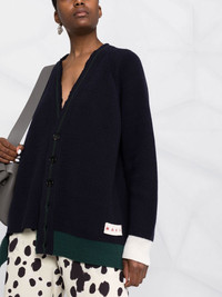 V-neck ribbed cardigan Marni transforms a classic ribbed cardigan with this AW22 virgin wool and cotton blend design that features contrast trims - a key detail for the Italian house this season. Made in Italy Composition Virgin Wool 70%, Cotton 30% SIZE & FIT Model measurements Height 5 ft 11 in(1.8 m) Bust/Chest 31.49 in(80 cm) Hips 36.61 in(93 cm) Waist 24.4 in(62 cm) FittingInformation This piece fits true to size. We recommend you get your regular size Cut for a loose fit Made with a mid-weight fabric Washing instructions Dry Clean Only