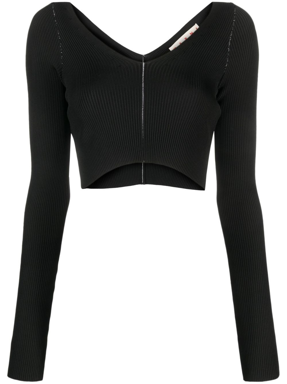 v-neck ribbed-knit crop top black knitted construction ribbed knit decorative stitching V-neck long sleeves V-back straight hem cropped Made In Italy Composition Viscose 94%, Polyester 6% SIZE & FIT Model measurements Height 5 ft 10 in(1.78 m) Bust/Chest 31.49 in(80 cm) Hips 37 in(94 cm) Waist 23.62 in(60 cm) FittingInformation Designed for a close fit throughout Made with a midweight knit, this piece offers some stretch This piece fits true to size – take your usual size Washing instructions Dry Clean Only