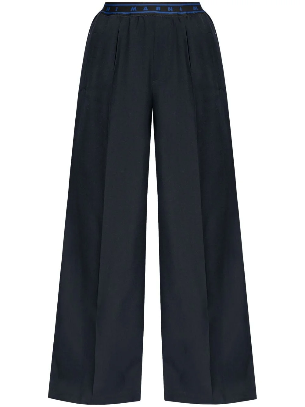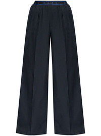wide-leg virgin wool trousers Highlights - Navy blue - Tropical virgin wool - Elasticated logo waistband - Slip pockets to the sides - Knife-pleat design - Wide leg Made in Italy Composition Virgin Wool 100%