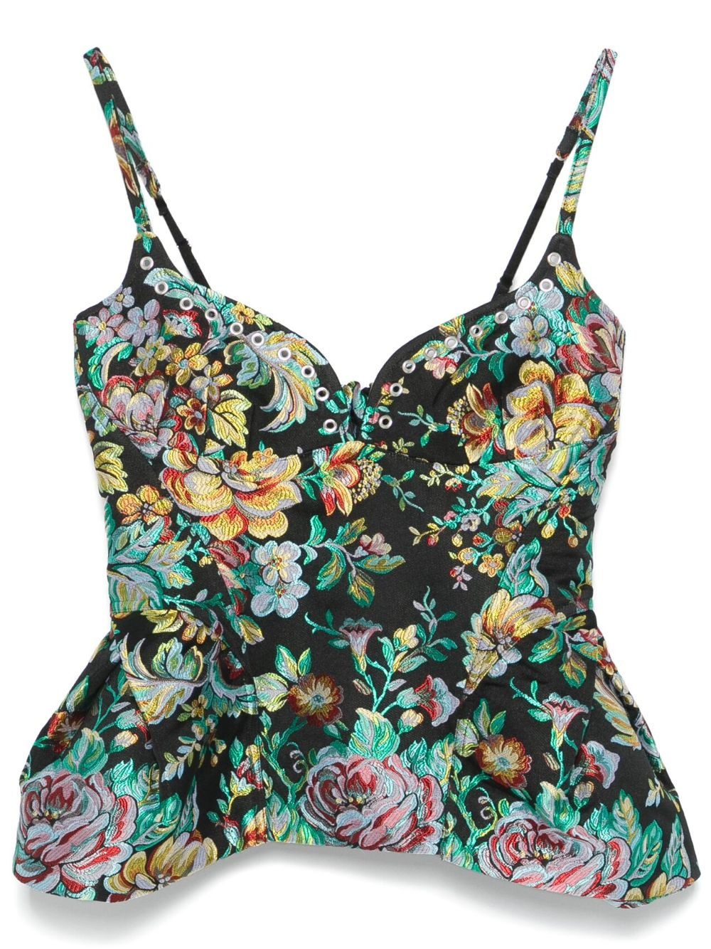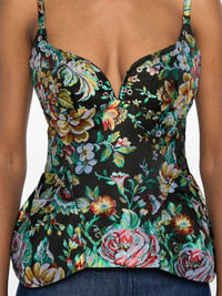 brocade corset-style top Highlights - Black/multicolour - Floral brocade effect - Corset style - Side zip fastening - Adjustable spaghetti straps - Sleeveless - Sweetheart neck - Metal eyelet detailing - Side pleat detailing - Back shirred panel - Full lining - Asymmetric hem Imported Composition Outer: Acetate 67%, Polyester 37% Lining: Viscose 100% SIZE & FIT Model measurements Height 5 ft 11 in(1.8 m) Bust/Chest 31.49 in(80 cm) Hips 36.61 in(93 cm) Waist 24.4 in(62 cm) FittingInformation Designed for a slim fit that sits just away from the body offering a close yet comfortable fit The partially elasticated waistband offers increased movement and comfort at the waist Made from a midweight non-stretch fabric