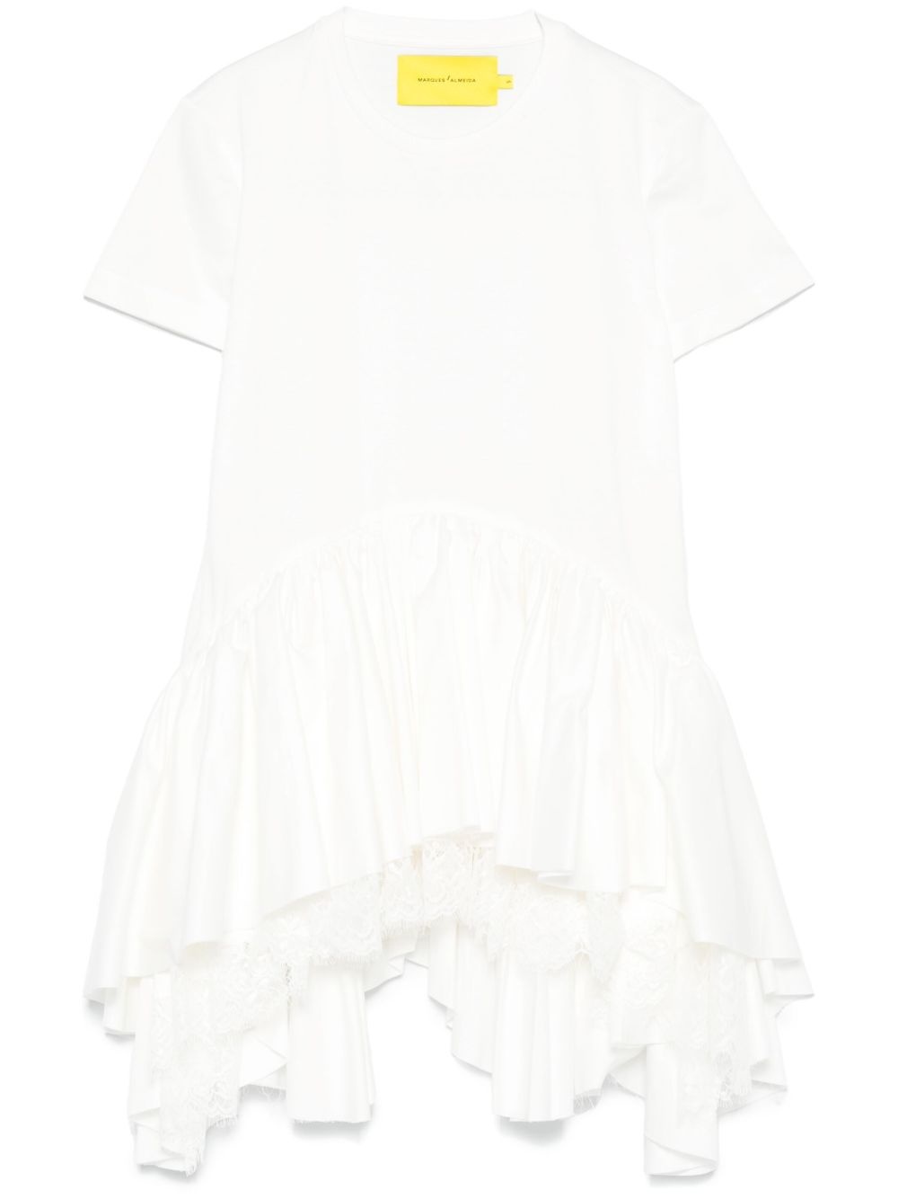 ruffled T-shirt Highlights - White - Crew neck - Short sleeves - Lace detailing Imported Composition Cotton 100%, Polyamide 100% SIZE & FIT Model measurements Height 5 ft 10 in(1.78 m) Bust/Chest 33.85 in(86 cm) Hips 36.61 in(93 cm) Waist 26.77 in(68 cm) FittingInformation Designed for a relaxed fit, this piece allows for comfort and movement when worn Made from a midweight fabric
