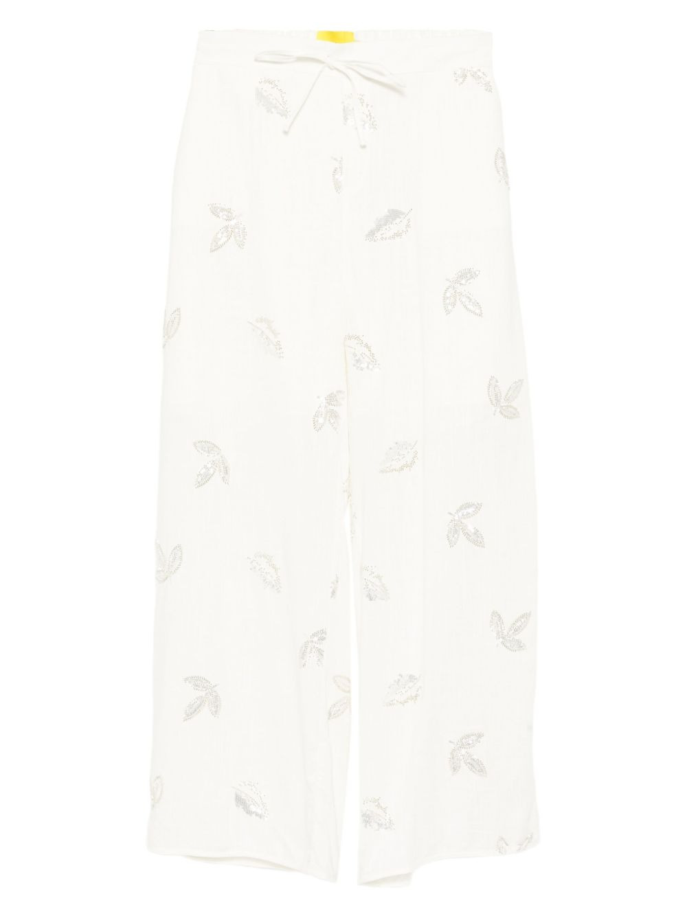sequin-embellished trousers Highlights - White - Elasticated drawstring waistband - Two side slit pockets - Sequin embellishment Imported Composition Viscose 77%, Linen/Flax 23% SIZE & FIT Model measurements Height 5 ft 10 in(1.78 m) Bust/Chest 31.88 in(81 cm) Hips 37 in(94 cm) Waist 25.19 in(64 cm) FittingInformation Designed with a wide-leg cut, these trousers allow for a close fit at the waist and offer a loose and roomy fit over the leg Adjust this piece’s waistband to your preference using the drawstring Made from a midweight non-stretch fabric Washing instructions Hand Wash