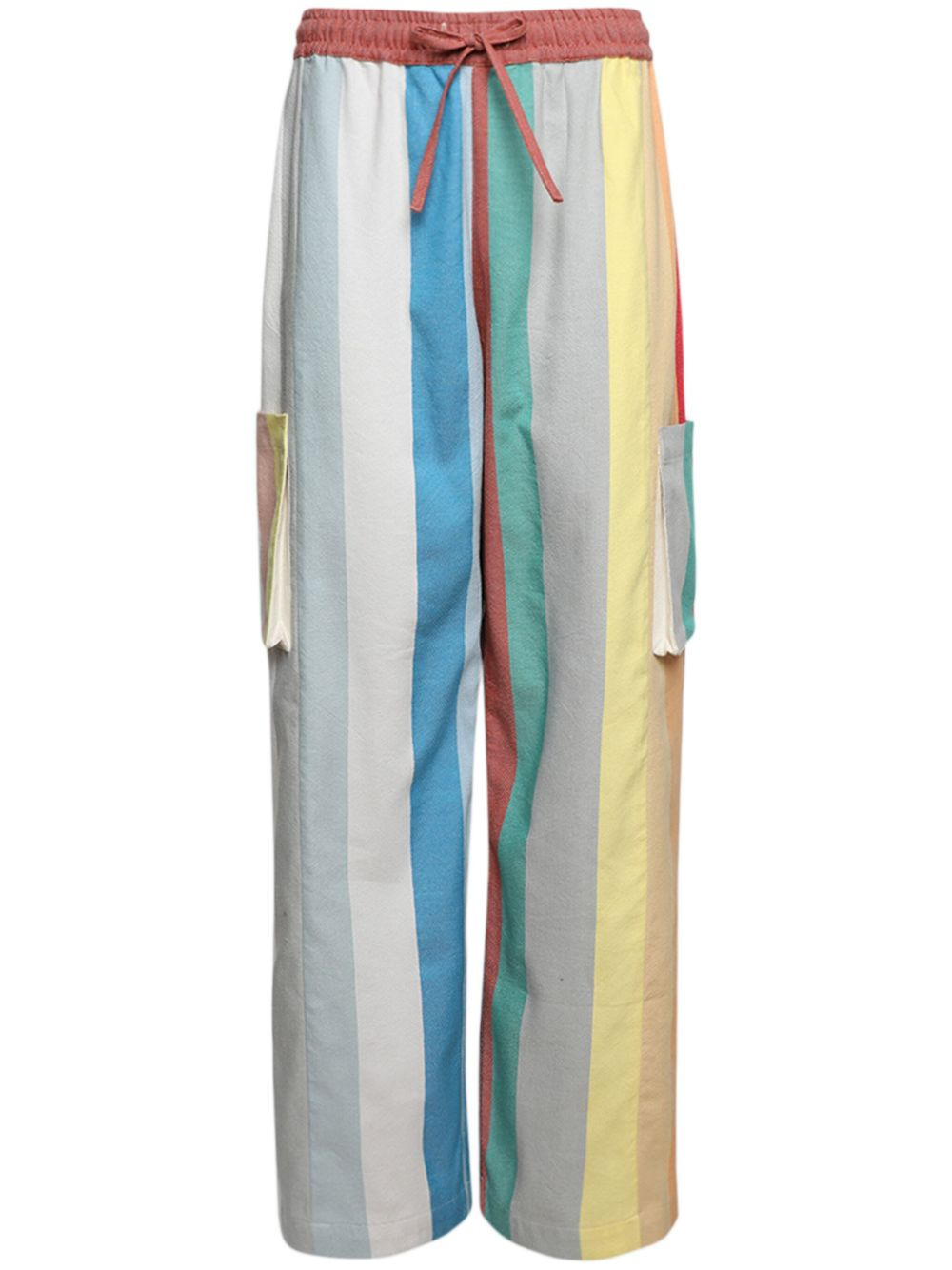 striped cotton cargo trousers Highlights - Blue/multicolour - Cotton - Vertical stripe print - Elasticated drawstring waistband - Two side cargo pockets - Straight leg Imported Composition Cotton 100% Washing instructions Dry Clean Only