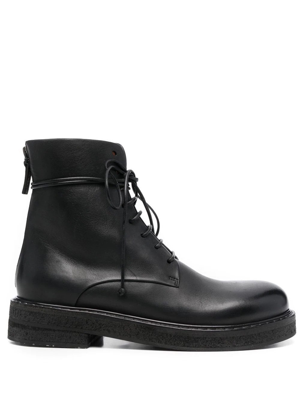 Parruca leather combat boots lace-up leather ankle boots from MARSELL featuring jet black, calf leather, round toe, front lace-up fastening, branded insole, low block heel and ankle-length. Made in Italy Composition Leather 100% SIZE & FIT Measurement HEEL 1.37 in(3.5 cm) Sole height 0.78 in(2 cm) HEIGHT 5.51 in(14 cm) FittingInformation This piece fits large – take one size down