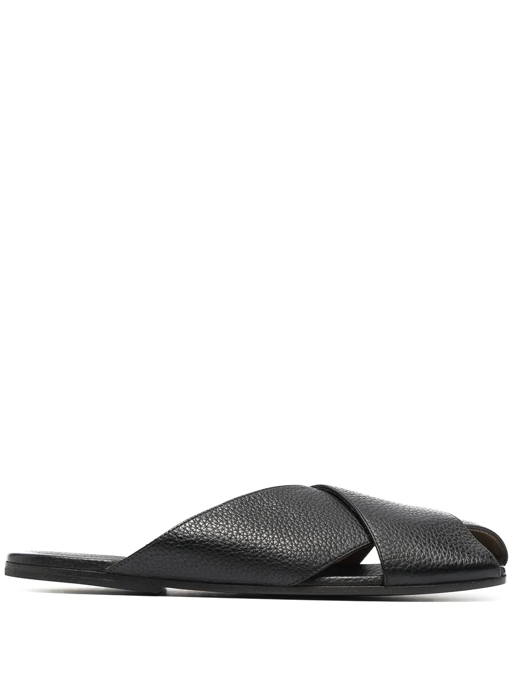 Spatula crossover sandals black leather grained texture square toe crossover strap detail open back flat sole Made in Italy Composition Outer: Leather 100% Lining: Leather 100% Sole: Leather 100% SIZE & FIT Measurement HEEL 0.39 in(1 cm)