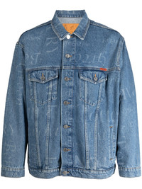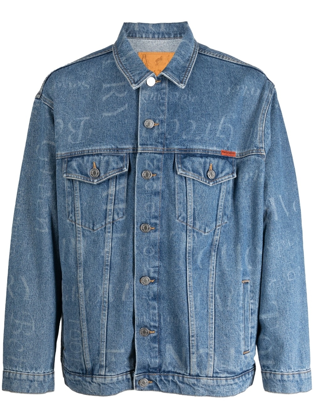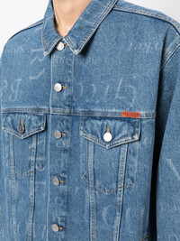 all-over logo-print denim jacket Crafted from pure cotton, this classic denim jacket gains Martine Rose's authentic touch by boasting a dim all-over logo print, softly contrasting with the blue background. Highlights - Blue - Cotton - Denim - All-over logo print - Classic collar - Two chest patch pockets - Two side welt pockets - Front button fastening - Long sleeves - Buttoned cuffs - Belted waist tabs - Straight hem Made in Italy Composition Cotton 100% SIZE & FIT Model measurements Height 6 ft 2 in(1.87 m) Bust/Chest 34.25 in(87 cm) Hips 36.22 in(92 cm) Waist 29.52 in(75 cm) Washing instructions Machine Wash