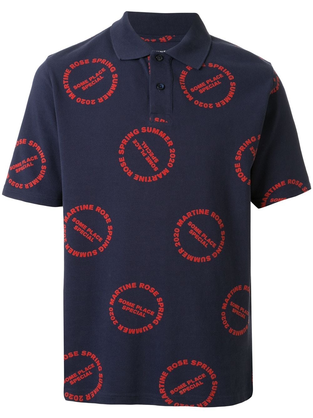 Baba logo print polo shirt Navy and red cotton Baba logo print polo shirt from Martine Rose featuring an all-over print, a classic polo collar, a front button fastening, short sleeves and a relaxed fit. Imported Composition Cotton 100% SIZE & FIT Model measurements Height 6 ft 1 in(1.86 m) Bust/Chest 34.64 in(88 cm) Hips 36.22 in(92 cm) Waist 27.16 in(69 cm) Measurement CHEST 43.3 in(110 cm) Shoulder Width 16.92 in(43 cm) FittingInformation This piece fits true to size. We recommend you get your regular size Cut for a slim fit Made with a mid-weight stretch fabric Washing instructions Dry Clean Only