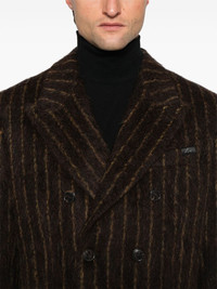 double-breasted blazer Highlights - Chocolate brown/caramel brown - Wool blend - Brushed effect - Pinstripe pattern - Double-breasted button fastening - Peak lapels - Shoulder pads - Long sleeves - Buttoned cuffs - Layered details - Chest welt pocket - Two front flap pockets - American rear vent - Internal jetted pocket - Striped lining - Straight hem - When buying this unisex item, keep in mind that it is graded in standard men's sizing. Made in Italy Composition Outer: Wool 50%, Polyamide 28%, Mohair 12%, Alpaca Wool 10% Lining: Acetate 50%, Cupro 50% SIZE & FIT Model measurements Height 5 ft 9 in(1.75 m) Bust/Chest 30.7 in(78 cm) Hips 36.22 in(92 cm) Waist 25.98 in(66 cm) FittingInformation This piece is unisex – if you usually select men's sizing expect a loose fit throughout; if you usually select women's sizes, expect an oversized fit The internal shoulder pads offer a structured shape Made from a midweight non-stretch fabric, this piece offers minimal elasticity when worn