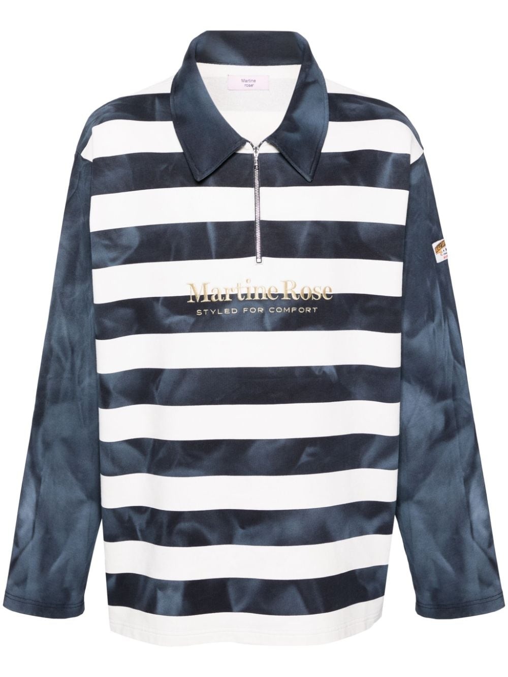 logo-embroidered polo sweatshirt Highlights - Navy blue/white - Cotton - Horizontal stripe pattern - Tie-dye pattern - Embroidered logo to the front - Logo patch at the sleeve - Polo collar - Short front zip fastening - Long sleeves - Short side slits - Straight hem - French terry lining - When buying this unisex item, keep in mind that it is graded in standard men's sizing. Imported Composition Cotton 100% SIZE & FIT Model measurements Height 5 ft 9 in(1.76 m) Bust/Chest 31.1 in(79 cm) Hips 36.61 in(93 cm) Waist 24.8 in(63 cm) FittingInformation This piece is unisex – if you usually select men's sizing expect a loose fit throughout; if you usually select women's sizes, expect an oversized fit Made from a midweight non-stretch fabric, this piece offers minimal elasticity when worn This piece fits true to size – take your usual size Washing instructions Machine Wash