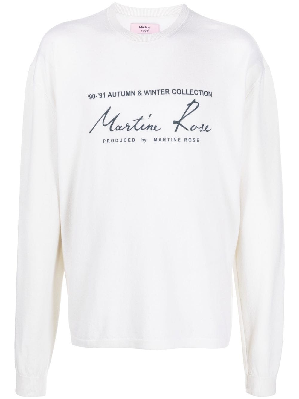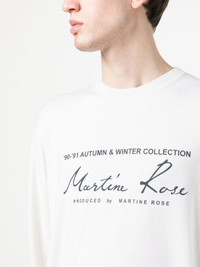 logo-print crewneck sweatshirt Crafted from a soft blend of virgin wool with a long-sleeved silhouette, this Martine Rose sweatshirt is printed with the label's signature scribble logo on the front. Imported Composition Virgin Wool 95%, Polyester 5% SIZE & FIT Model measurements Height 6 ft 2 in(1.87 m) Bust/Chest 35.82 in(91 cm) Hips 35.43 in(90 cm) Waist 27.95 in(71 cm) FittingInformation This piece fits true to size. We recommend you get your regular size Cut for a loose fit Made with a mid-weight fabric Measurement SLEEVE LENGTH 26.49 in(67.3 cm) LENGTH 25.51 in(64.8 cm) WAIST 42.99 in(109.2 cm) Shoulder Width 20.98 in(53.3 cm) Washing instructions Hand Wash