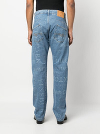 printed straight leg jeans Hailing from south London, Martine Rose dedicates these straight-leg jeans to their beloved hometown by enveloping the pair in a print which names a variety of London underground stations. Highlights - Blue - Cotton - Logo patch to the front - All-over graphic print - High waist - Belt loops - Front button and zip fastening - Classic five pockets - Straight leg - When buying this unisex item, keep in mind that it is graded in standard men's sizing. Made in Italy Composition Cotton 100% SIZE & FIT Model measurements Height 5 ft 11 in(1.8 m) Bust/Chest 31.49 in(80 cm) Hips 36.22 in(92 cm) Waist 25.59 in(65 cm)