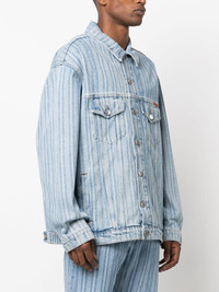 striped denim jacket Martine Rose denim pieces are enhanced with rustic influences for a lived-in appeal. This jacket boasts an all-over pinstripe print, while the bright orange logo tab at the chest lends a signature touch. Highlights - Light-blue wash - Cotton denim - Pinstripe print - Logo patch at the chest - Straight-point collar - Front button fastening - Drop shoulder - Long sleeves - Buttoned cuffs - Two chest patch pockets - Two side slit pockets - Straight hem Made in Italy Composition Cotton 100% SIZE & FIT Model measurements Height 6 ft 2 in(1.88 m) Bust/Chest 35.03 in(89 cm) Hips 35.82 in(91 cm) Waist 27.95 in(71 cm) FittingInformation Designed to be unstructured, offering a loose fit throughout Sturdy and hard-wearing, this denim piece offers no stretch This piece fits true to size – take your usual size Washing instructions Machine Wash