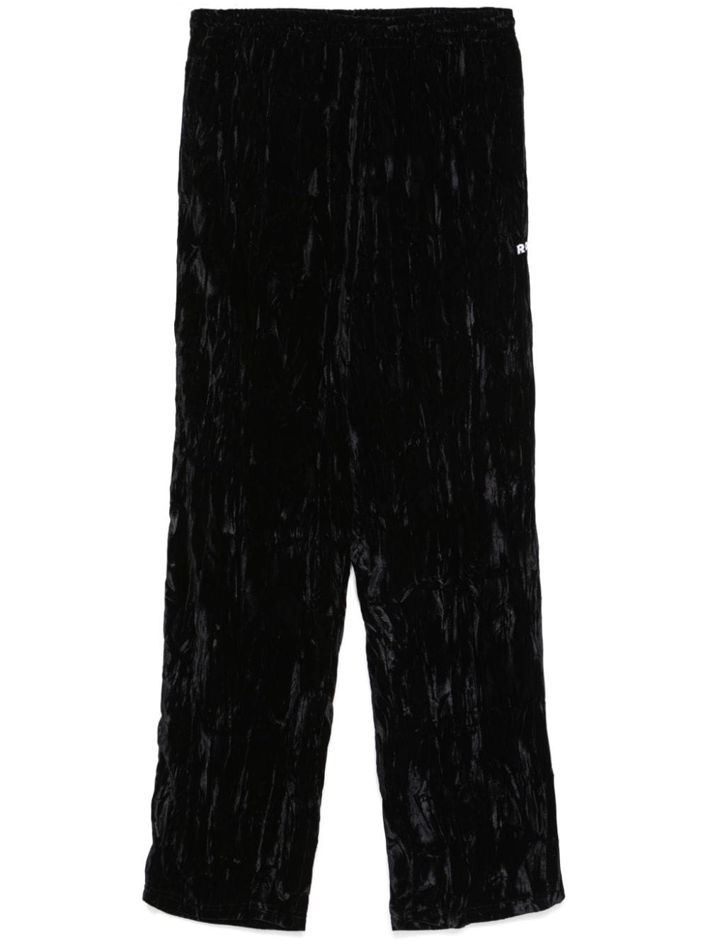 wide-leg trousers Highlights - Black - Crushed velvet - Wide leg - Elasticated waistband with internal drawstring - Two side zip-fastening pockets - Embroidered logo to the side - When buying this unisex item, keep in mind that it is graded in standard men's sizing. Imported Composition Acetate 63%, Rayon 37% SIZE & FIT Model measurements Height 5 ft 9 in(1.75 m) Bust/Chest 31.88 in(81 cm) Hips 34.64 in(88 cm) Waist 24.01 in(61 cm) FittingInformation This piece is unisex and is designed with a wide-leg, whether you usually select women's or men's sizes The elasticated waist allows for a comfortable fit Made from a midweight non-stretch fabric