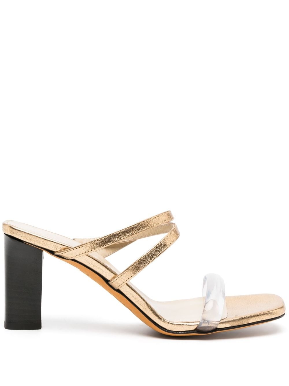 Samantha 80 mm leather sandals Highlights - Gold-tone - Calf leather - Transparent strap - Crossover strap detail - Square open toe - Slip-on style - Branded insole - High block heel Made in Italy Composition Lining: Calf Leather 100% Outer: Calf Leather 100%, Rubber 100% Sole: Calf Leather 100% SIZE & FIT Measurement HEEL 3.14 in(8 cm) Sole height 0.39 in(1 cm)