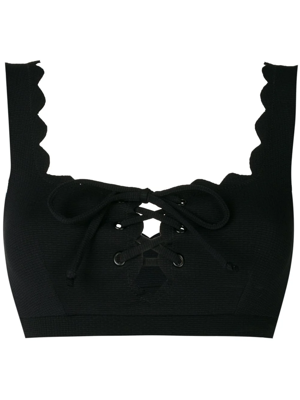 scalloped-trim bikini top Black scalloped-trim bikini top from marysia featuring a square neck, a lace up detail and scalloped details. Swimwear must be tried on over your own garments. Imported Composition Polyamide 88%, Spandex/Elastane 12% SIZE & FIT Model measurements Height 5 ft 9 in(1.75 m) Bust/Chest 32.67 in(83 cm) Hips 36.22 in(92 cm) Waist 24.8 in(63 cm) Washing instructions Hand Wash