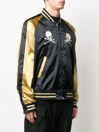 skull print bomber jacket Black and gold-tone skull print bomber jacket from MASTERMIND WORLD featuring a panelled colour block design, a skull print, a round neck, a front zip fastening, long sleeves and side pockets. Imported Composition Outer: Nylon 100% Lining: Polyester 100% SIZE & FIT Model measurements Height 6 ft 1 in(1.86 m) Bust/Chest 37.4 in(95 cm) Hips 37 in(94 cm) Waist 30.7 in(78 cm) FittingInformation This piece fits true to size. We recommend you get your regular size Cut for a loose fit Made with a mid-weight non-stretch fabric Washing instructions Do Not Wash/Do Not Dry Clean