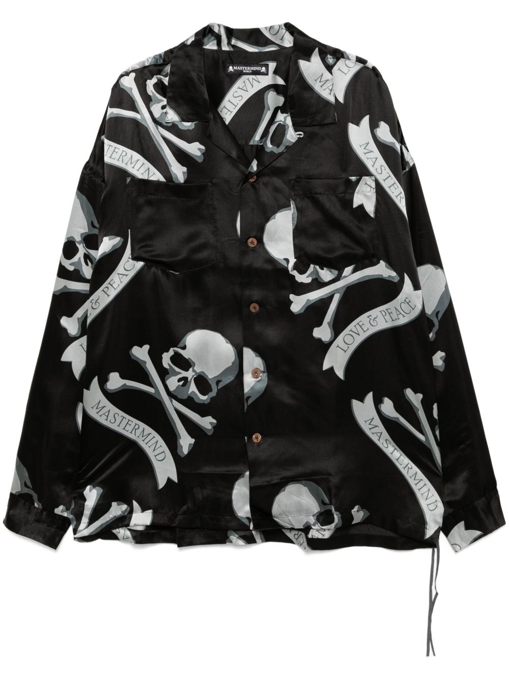 skull-printed shirt Highlights - Black/grey - Silk - Satin weave - Skull print - Front button fastening - Classic collar - Long sleeves - Buttoned cuffs - Curved hem - High-low hem Imported Composition Silk 100% SIZE & FIT Model measurements Height 6 ft 2 in(1.87 m) Bust/Chest 33.07 in(84 cm) Hips 35.43 in(90 cm) Waist 26.77 in(68 cm) FittingInformation Designed for an oversized fit, offering additional room throughout Made from a lightweight non-stretch fabric