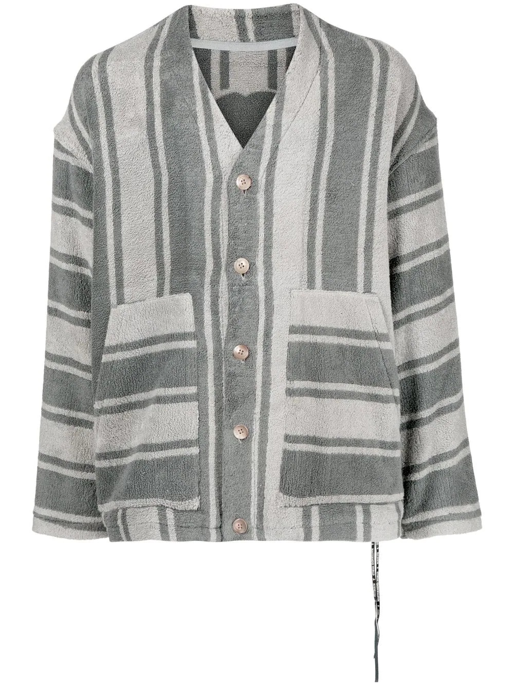 striped cotton cardigan light grey ash grey cotton multi-way stripe pattern front button placket V-neck drop shoulder long sleeves Imported Composition Cotton 100% SIZE & FIT Model measurements Height 6 ft 2 in(1.87 m) Bust/Chest 34.25 in(87 cm) Hips 36.22 in(92 cm) Waist 29.52 in(75 cm) FittingInformation This piece fits true to size. We recommend you get your regular size Cut for a loose fit Made with a mid-weight non-stretch fabric Washing instructions Hand Wash