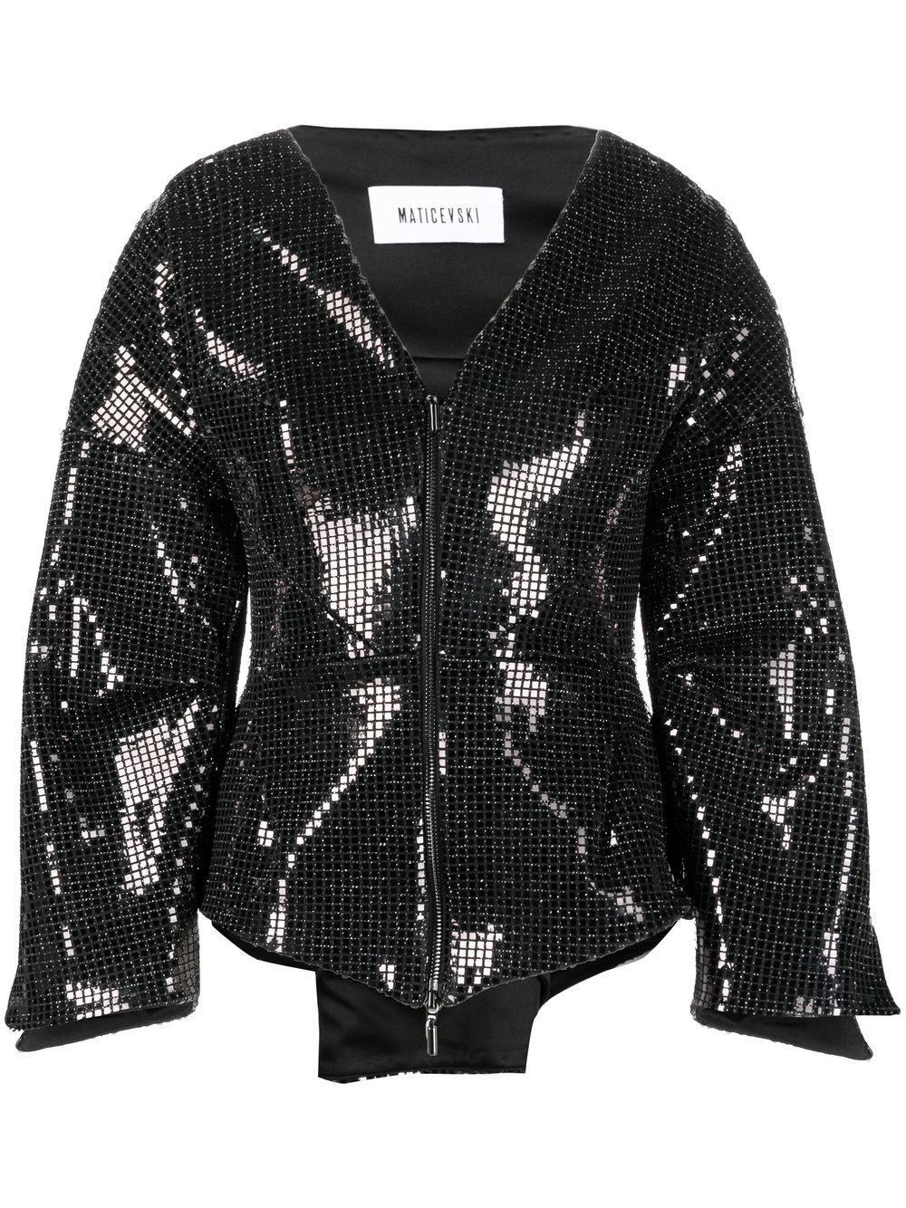 Rythmical mirror V-neck jacket black silk blend metallic sheen V-neck corset style long sleeves front two-way zip fastening mirrored glass Imported Composition Outer: Polyester 90%, Metal 5%, Spandex/Elastane 5% Lining: Silk 93%, Spandex/Elastane 7% SIZE & FIT Model measurements Height 5 ft 11 in(1.8 m) Bust/Chest 33.07 in(84 cm) Hips 37.4 in(95 cm) Waist 25.19 in(64 cm) FittingInformation This piece fits true to size. We recommend you get your regular size Cut for a slim fit Made with a mid-weight stretch fabric