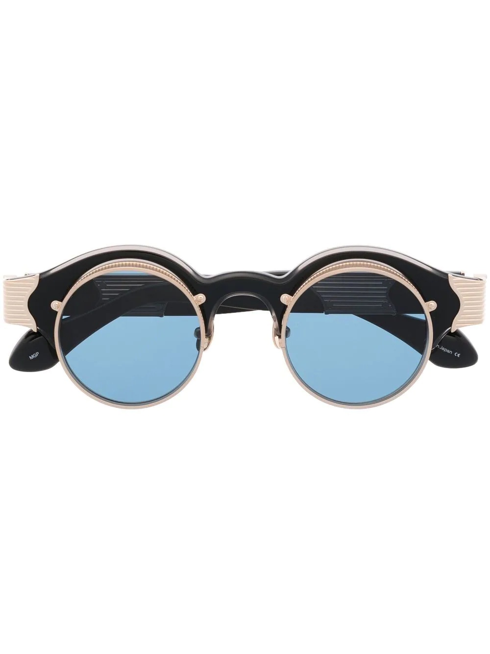 10605H round-frame sunglasses black gold-tone round frame blue tinted lenses curved arms These glasses come with a protective case. Imported Composition Acetate 100%, Metal 100% SIZE & FIT Measurement Arm Length 5.62 in(14.3 cm) Bridge Width 0.94 in(2.4 cm) Lens Diameter 1.69 in(4.3 cm) Total Width 5.7 in(14.5 cm)