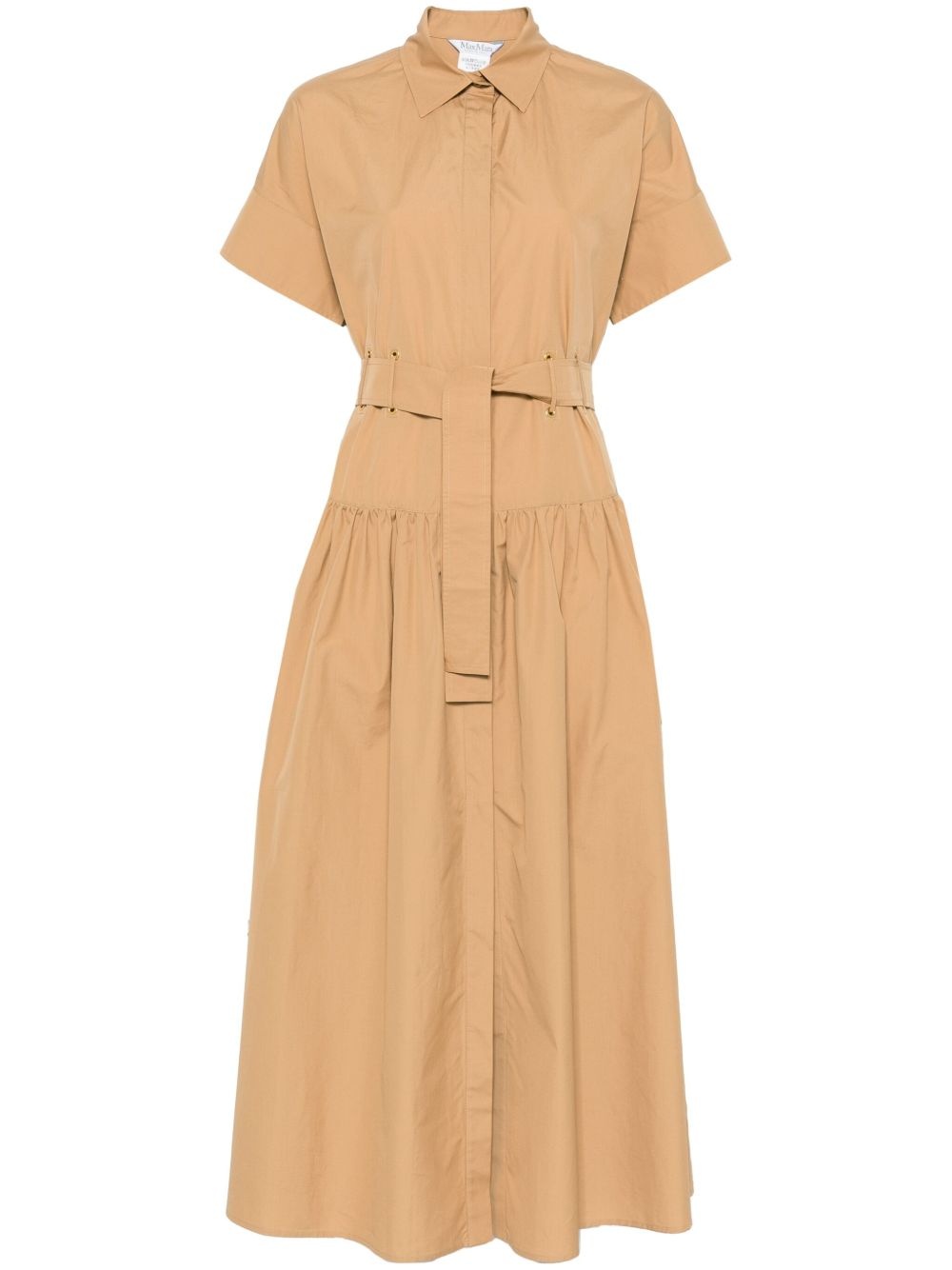 Agoraio midi dress Highlights - Caramel brown - Concealed front-button fastening - Buttoned cuffs - Belted waist - Pleated Made in Italy Composition Cotton 100% SIZE & FIT FittingInformation Designed for a relaxed fit, this piece allows for comfort and movement when worn The adjustable tie waist gives a more adaptable and personalised fit Made from a midweight non-stretch fabric