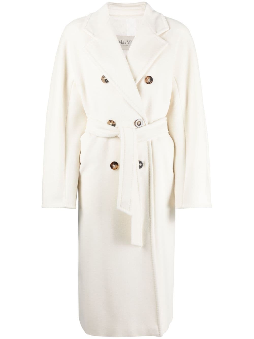 belted double-breasted coat Founded in the Italian city of Reggio Emilia in 1951, Max Mara is known for its exquisitely crafted outerwear, as demonstrated with this coat. It’s spun from a sumptuous blend of white wool and cashmere to a classic double-breasted silhouette. Highlights - White - Virgin wool-cashmere blend - Notched lapels - Double-breasted button fastening - Detachable waist belt - Long sleeves - Two side inset pockets - Full lining - Calf-length - Straight hem Made in Italy Composition Outer: Virgin Wool 90%, Cashmere 10% Lining: Cupro 98%, Metallic Fibre 1%, Viscose 1% SIZE & FIT Model measurements Height 5 ft 11 in(1.8 m) Bust/Chest 34.25 in(87 cm) Hips 35.82 in(91 cm) Waist 24.8 in(63 cm) FittingInformation Designed for an oversized fit, offering additional room throughout The tie fastening gives an adaptable and personalised fit Made from a midweight non-stretch fabric This piece fits true to size – take your usual size