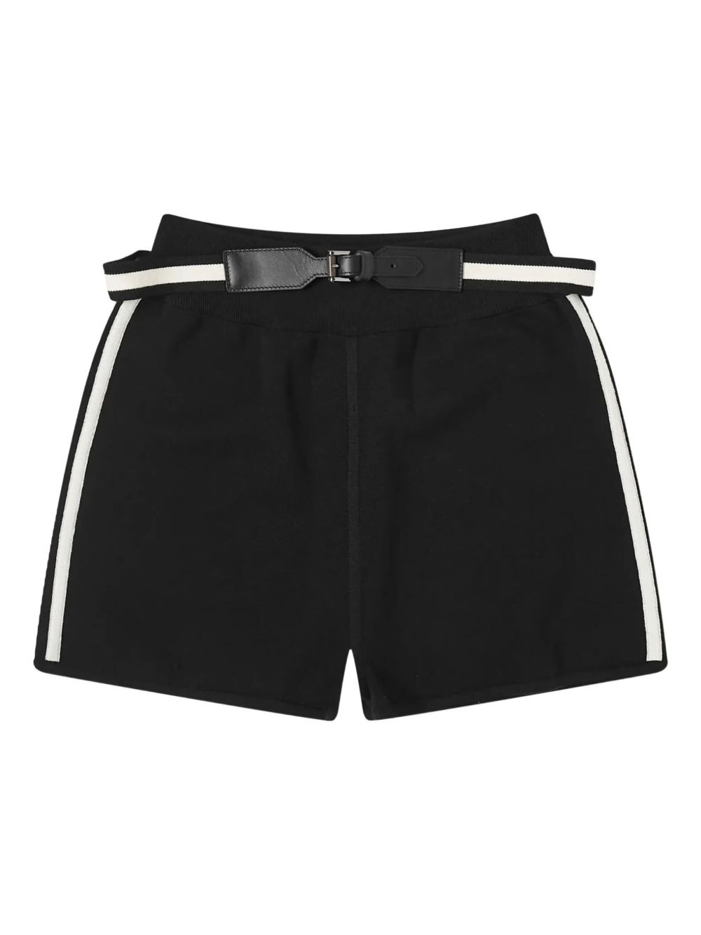 belted side-stripe shorts Highlights - Black - Leather belt - Off-white side stripes - Straight hem Imported Composition Calf Leather 100%, Cotton 80%, Polyester 20% Washing instructions Read Manufacturer Guidelines