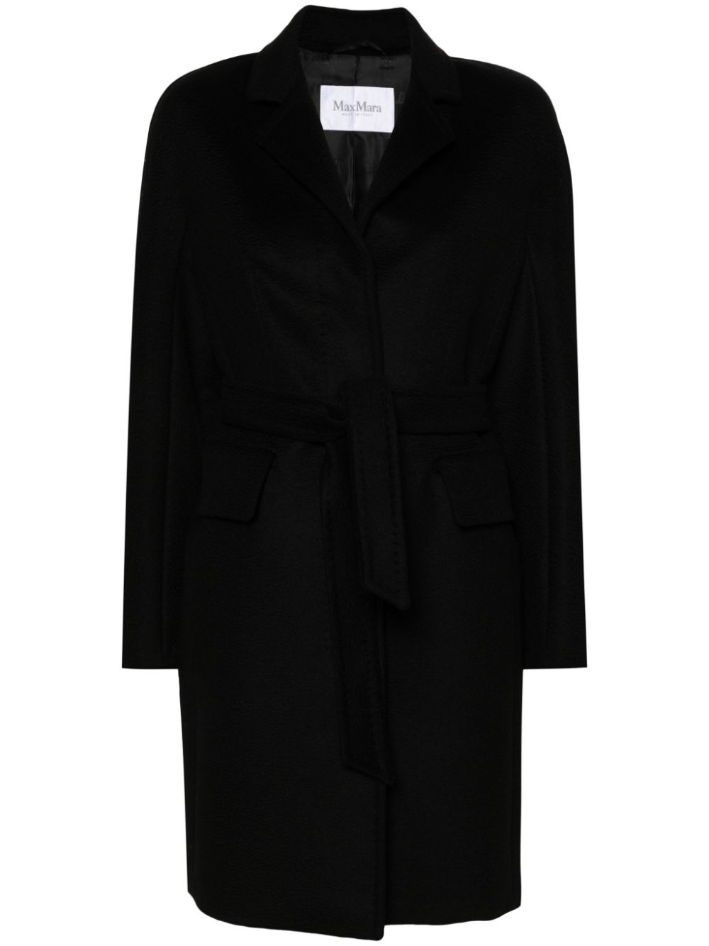 Bingo belted camel-hair coat Timeless outerwear is Max Mara's speciality, and the Bingo coat is proof. Cut to a sleek single-breasted silhouette complemented by a detachable waist belt to allow custom styling, it is characterised by its camel hair construction, lending a tactile feel. Highlights - Black - Camel hair - Notched lapels - Concealed front button fastening - Long sleeves - Detachable waist belt - Two front flap pockets - Central rear vent - Straight hem Made in Italy Composition Lining: Viscose 100% Outer: Camel Hair 100% SIZE & FIT Model measurements Height 5 ft 10 in(1.77 m) Bust/Chest 33.07 in(84 cm) Hips 34.64 in(88 cm) Waist 25.59 in(65 cm) FittingInformation Designed for a slim fit that sits just away from the body offering a close yet comfortable fit The tie fastening gives an adaptable and personalised fit Made from a midweight non-stretch fabric This piece fits true to size – take your usual size