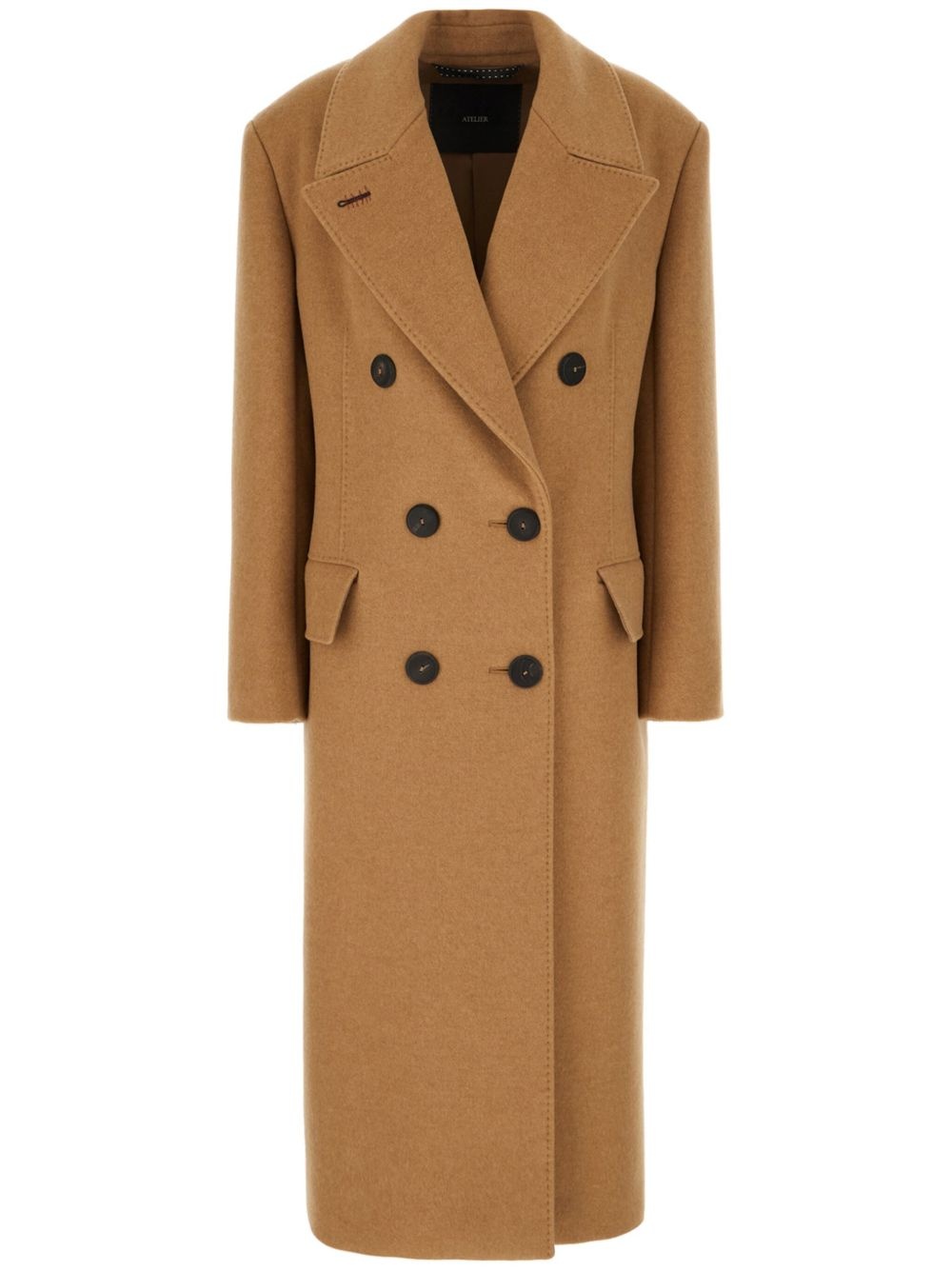 Certo coat Highlights - Camel brown - Cashmere blend - Felted finish - Double-breasted button fastening - Wide peak lapels - Embroidered logo to the lapel - Shoulder pads - Long sleeves - Faux buttoned cuffs - Dart detailing - Two side flap pockets - Central rear vent - Internal slip pocket - Full lining - Straight hem - Mid-calf length Imported Composition Outer: Cashmere 53%, Camel Hair 45%, Wool 2% Lining: Cupro 100% Washing instructions Read Manufacturer Guidelines