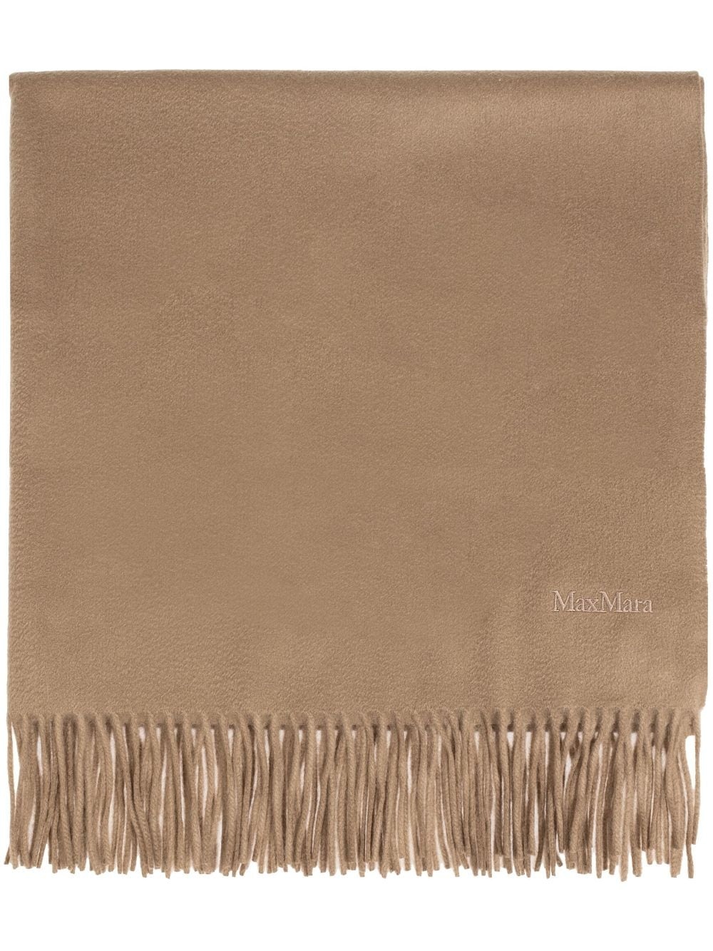 embroidered-logo cashmere scarf Highlights - Brown - Cashmere - Embroidered logo to the front - Fringed edge - Rectangle shape - Wraparound style Made in Italy Composition Cashmere 100% SIZE & FIT Measurement LENGTH 77.16 in(196 cm) WIDTH 27.55 in(70 cm) Washing instructions Read Manufacturer Guidelines