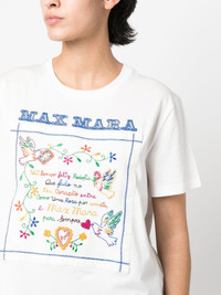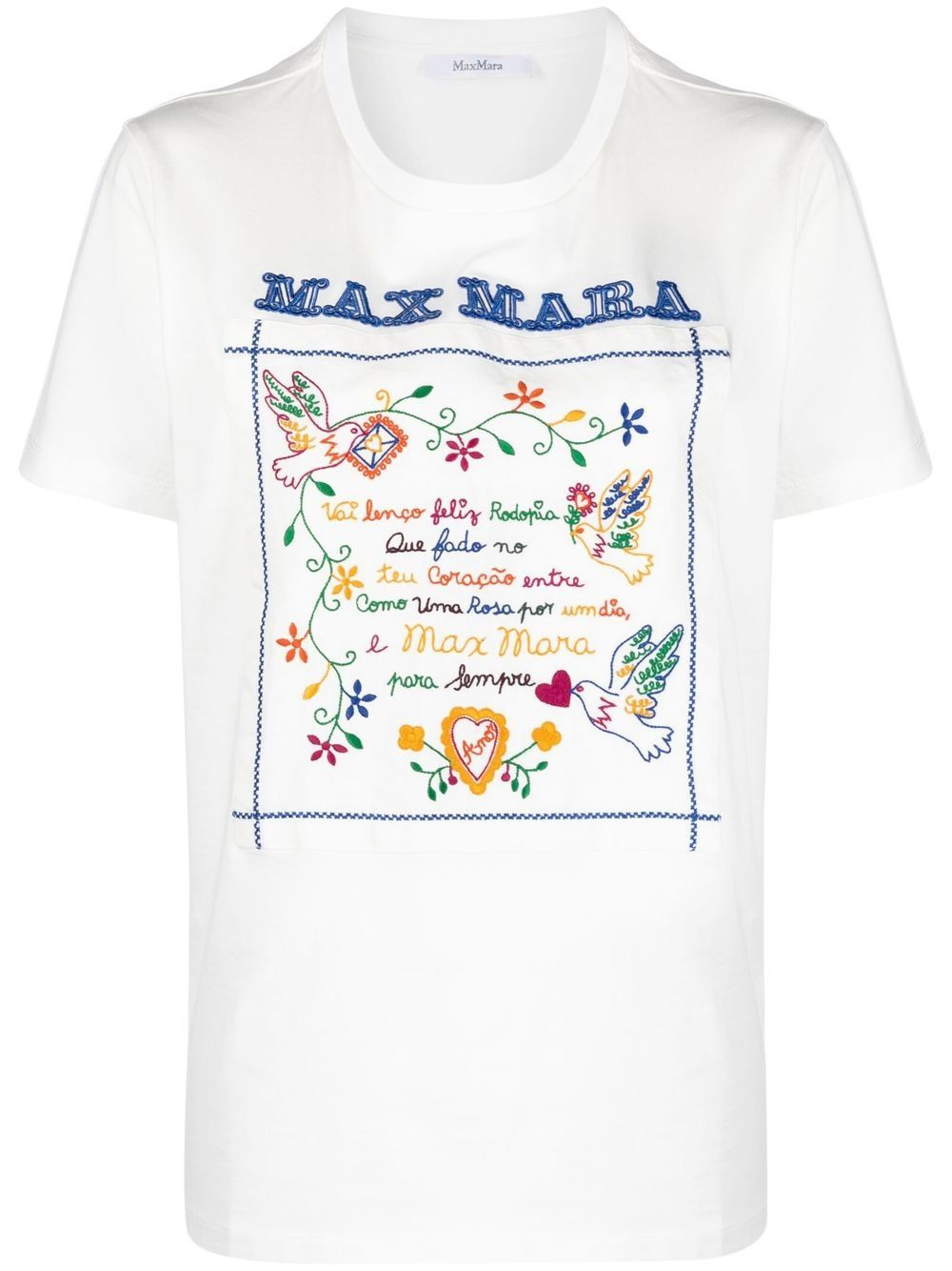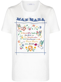 embroidered-slogan T-shirt white linen/flax-cotton blend embroidered slogan embroidered logo to the front crew neck short sleeves straight hem Imported Composition Cotton 100%, Linen/Flax 100% SIZE & FIT Model measurements Height 5 ft 10 in(1.78 m) Bust/Chest 33.07 in(84 cm) Hips 35.82 in(91 cm) Waist 25.98 in(66 cm) FittingInformation This piece fits true to size. We recommend you get your regular size Cut for a loose fit Made with a mid-weight fabric Washing instructions Machine Wash