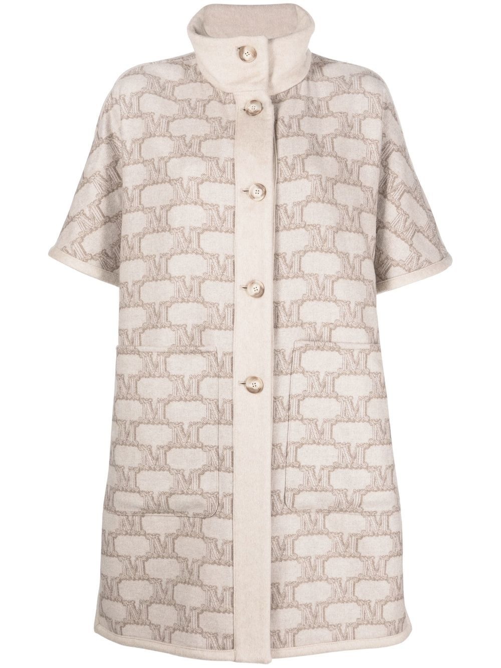 Enica reversible monogram-pattern coat Enica reversible monogram-pattern coat from Max Mara (VIP) featuring brown, virgin wool-cashmere blend, monogram pattern, reversible, stand-up collar, front button fastening, short sleeves, two front patch pockets, side slits, straight hem and above-knee length. Made in Italy Composition Cashmere 60%, Virgin Wool 40% SIZE & FIT Model measurements Height 5 ft 9 in(1.74 m) Bust/Chest 32.28 in(82 cm) Hips 35.82 in(91 cm) Waist 24.01 in(61 cm) Measurement LENGTH 35.82 in(91 cm) FittingInformation This is a one size item Cut for a loose fit Made with a mid-weight non-stretch fabric Washing instructions Dry Clean Only