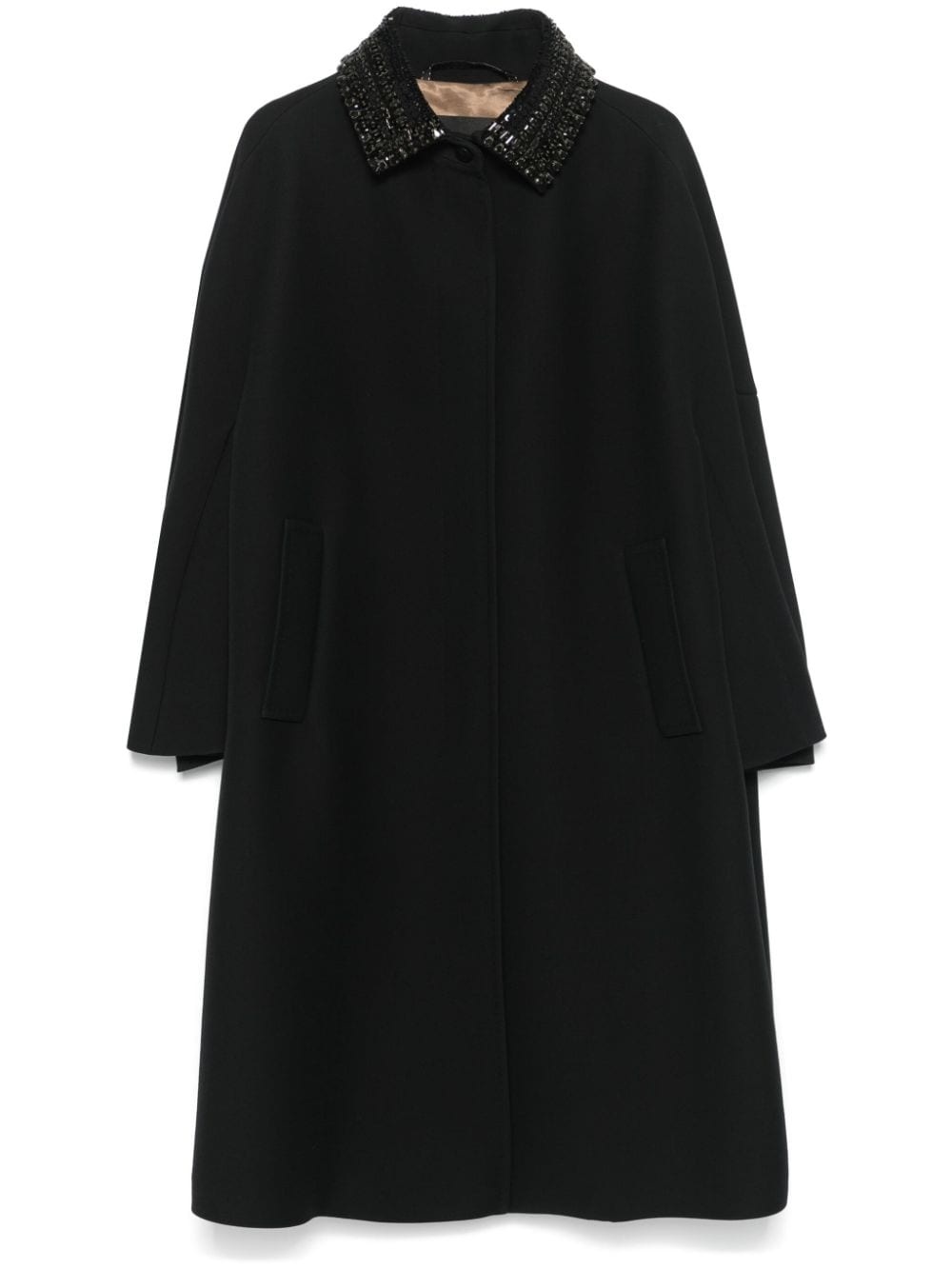 Faraday coat Highlights - Black - Virgin wool-silk blend - Cady texture - Concealed front button fastening - Classic collar - Crystal embellishment - Long sleeves - Two side welt pockets - Partial lining - Straight hem - Mid-length Made in Italy Composition Outer: Virgin Wool 85%, Silk 15% Lining: Cupro 100% SIZE & FIT Model measurements Height 5 ft 11 in(1.8 m) Bust/Chest 32.67 in(83 cm) Hips 36.22 in(92 cm) Waist 24.4 in(62 cm) FittingInformation Designed to be unstructured, offering a loose fit throughout Made from a heavyweight non-stretch fabric