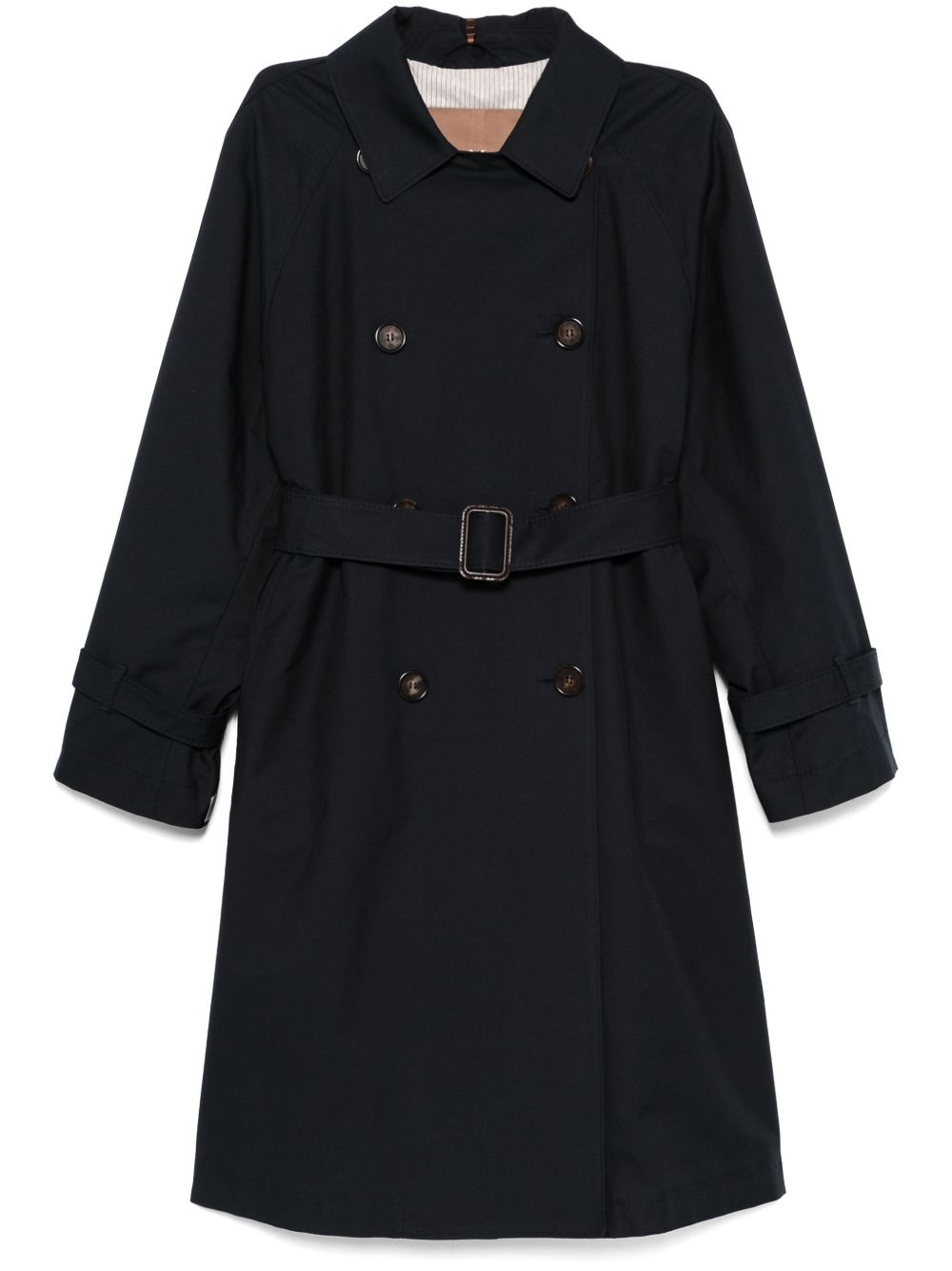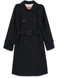 gabardine-weave trench coat Highlights - Navy blue - Double-breasted button fastening - Long sleeves - Belted waist - Two front jetted pockets Imported Composition Cotton 66%, Polyester 34% SIZE & FIT Model measurements Height 5 ft 10 in(1.78 m) Bust/Chest 33.46 in(85 cm) Hips 36.22 in(92 cm) Waist 23.22 in(59 cm) FittingInformation Designed to be unstructured, offering a loose fit throughout The belt offers adjustability for fitted preferences Made from a midweight non-stretch fabric