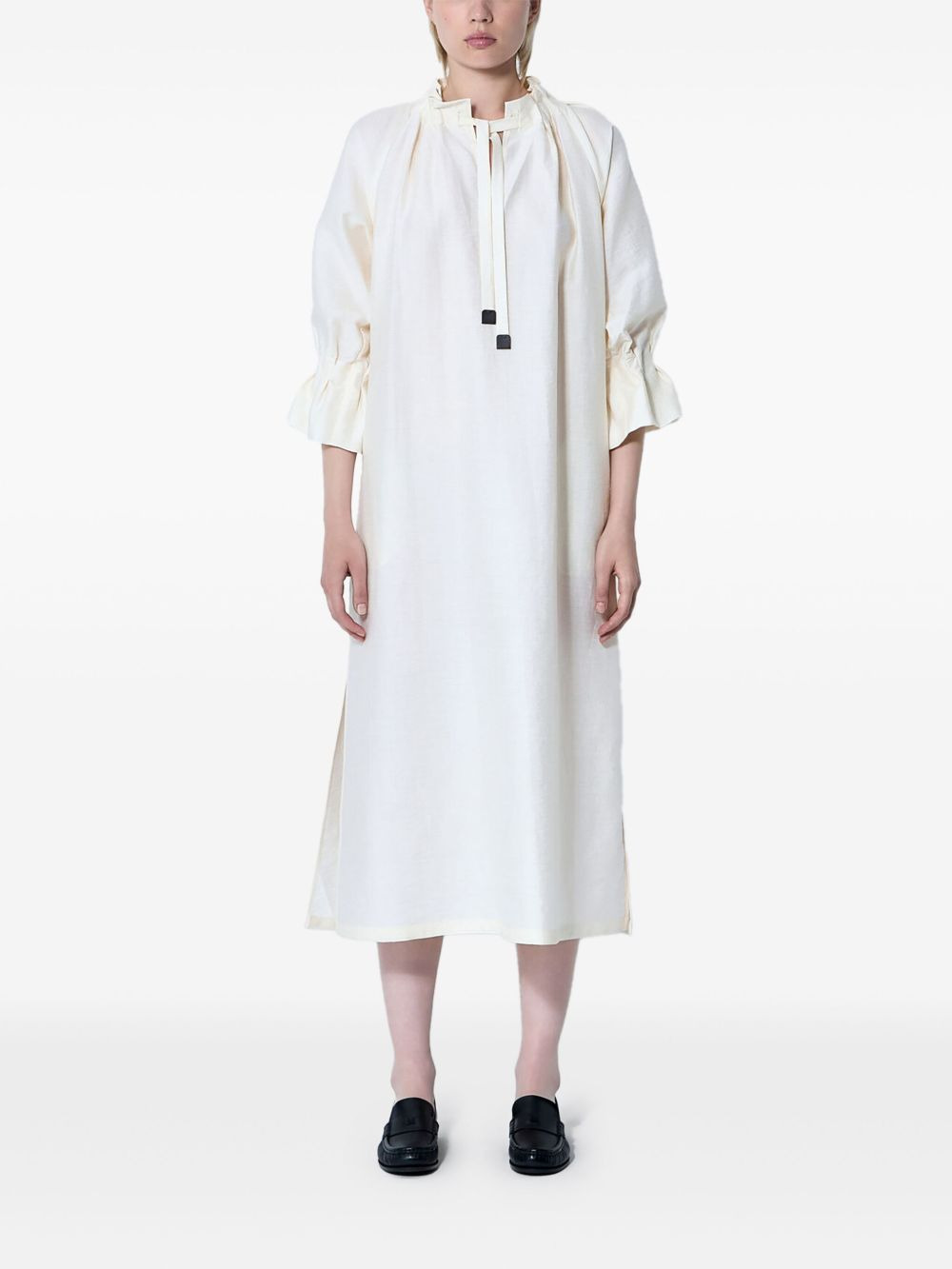 Jene ruffled-sleeve midi dress Highlights - White - Drawstring collar - Three-quarter sleeves - Ruffled sleeves - Welt pockets - Straight hem Made in Italy Composition Linen/Flax 51%, Silk 37%, Nylon 12% Washing instructions Read Manufacturer Guidelines